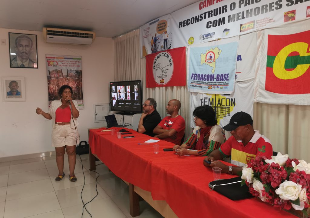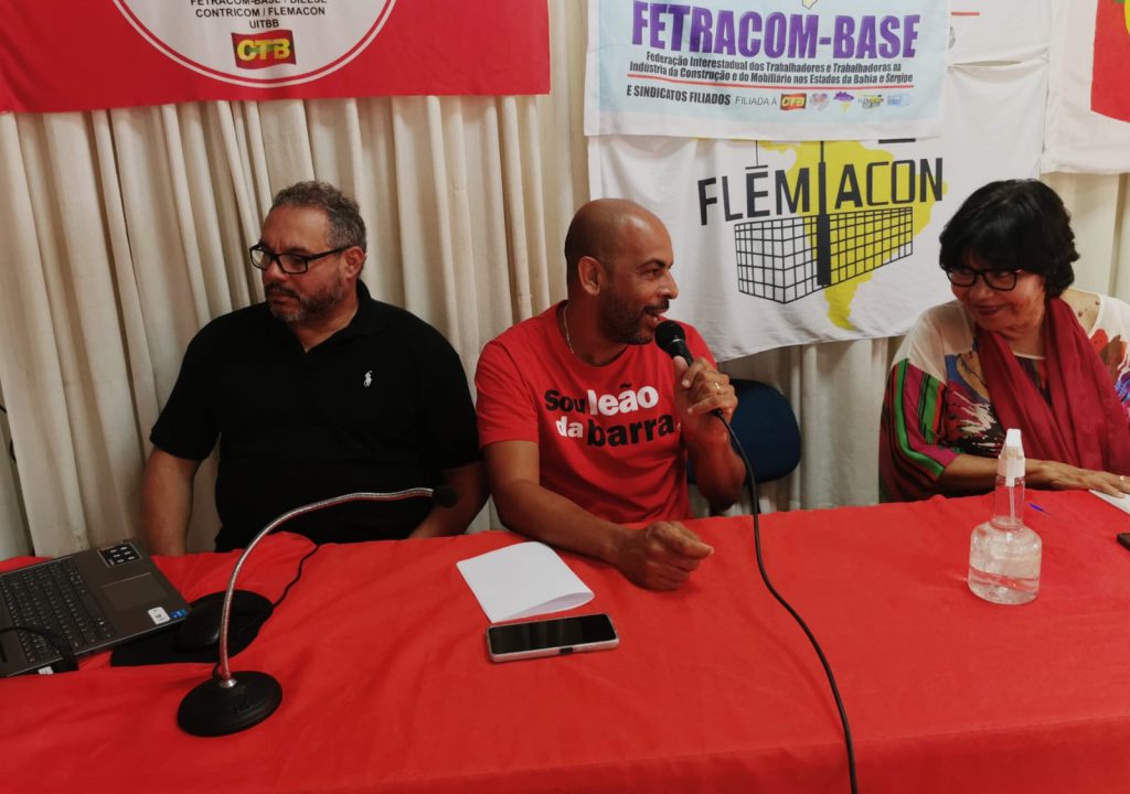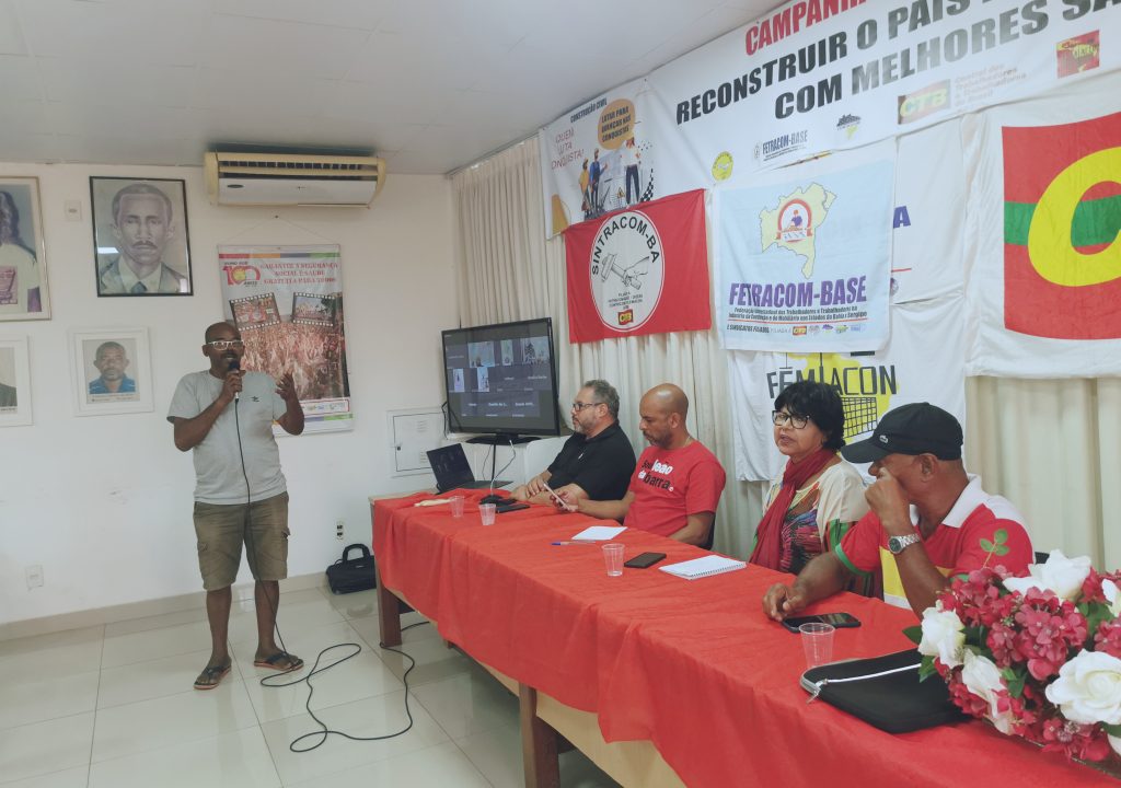 A mesa foi composta pelos presidentes do SINTRACOM-BA Carlos Silva, da FETRACOM-BASE Edson Cruz, da FLEMACON Lúcia Maia e pelo diretor José Nivalto.