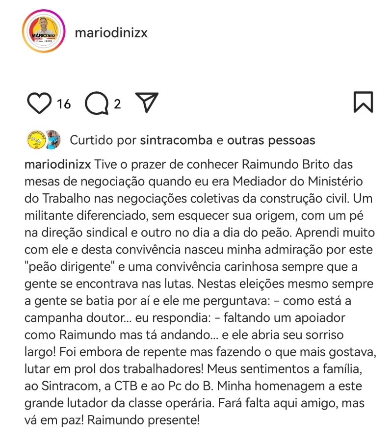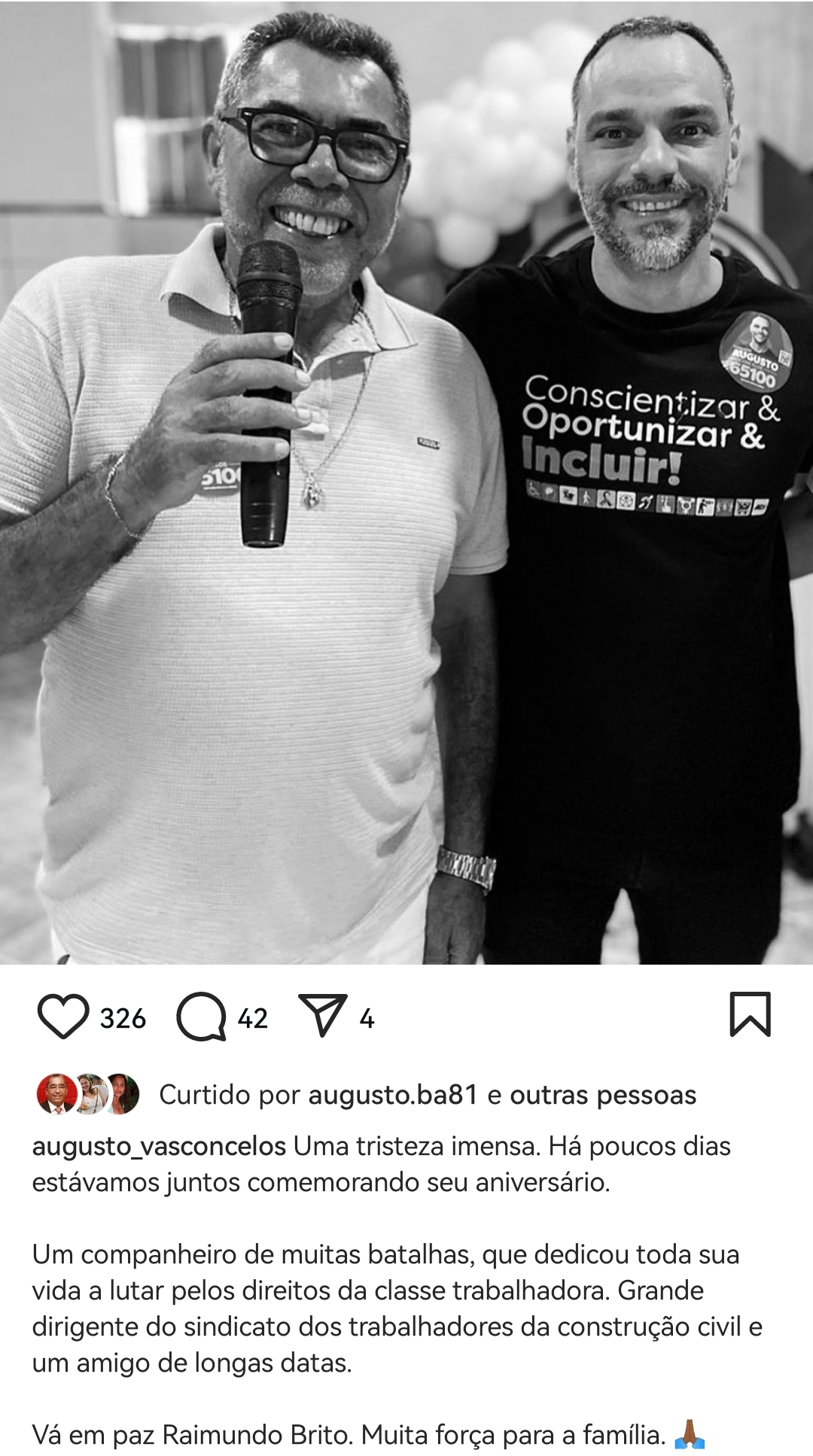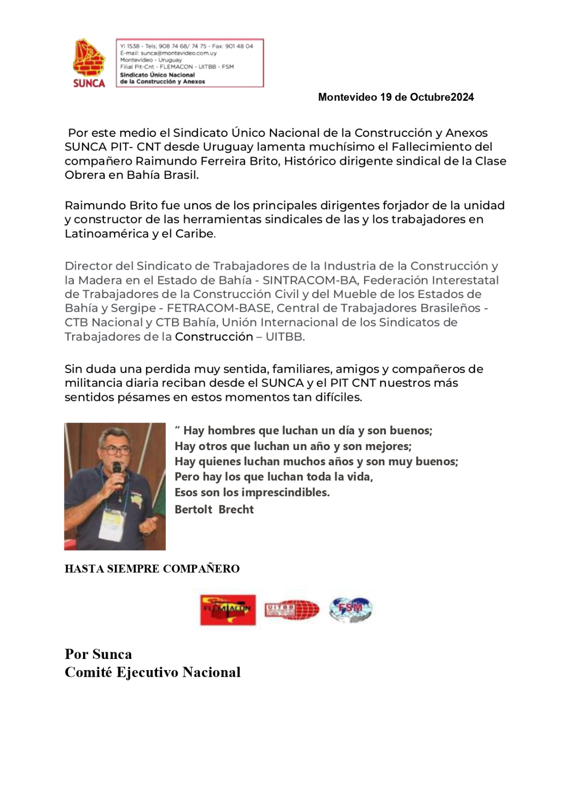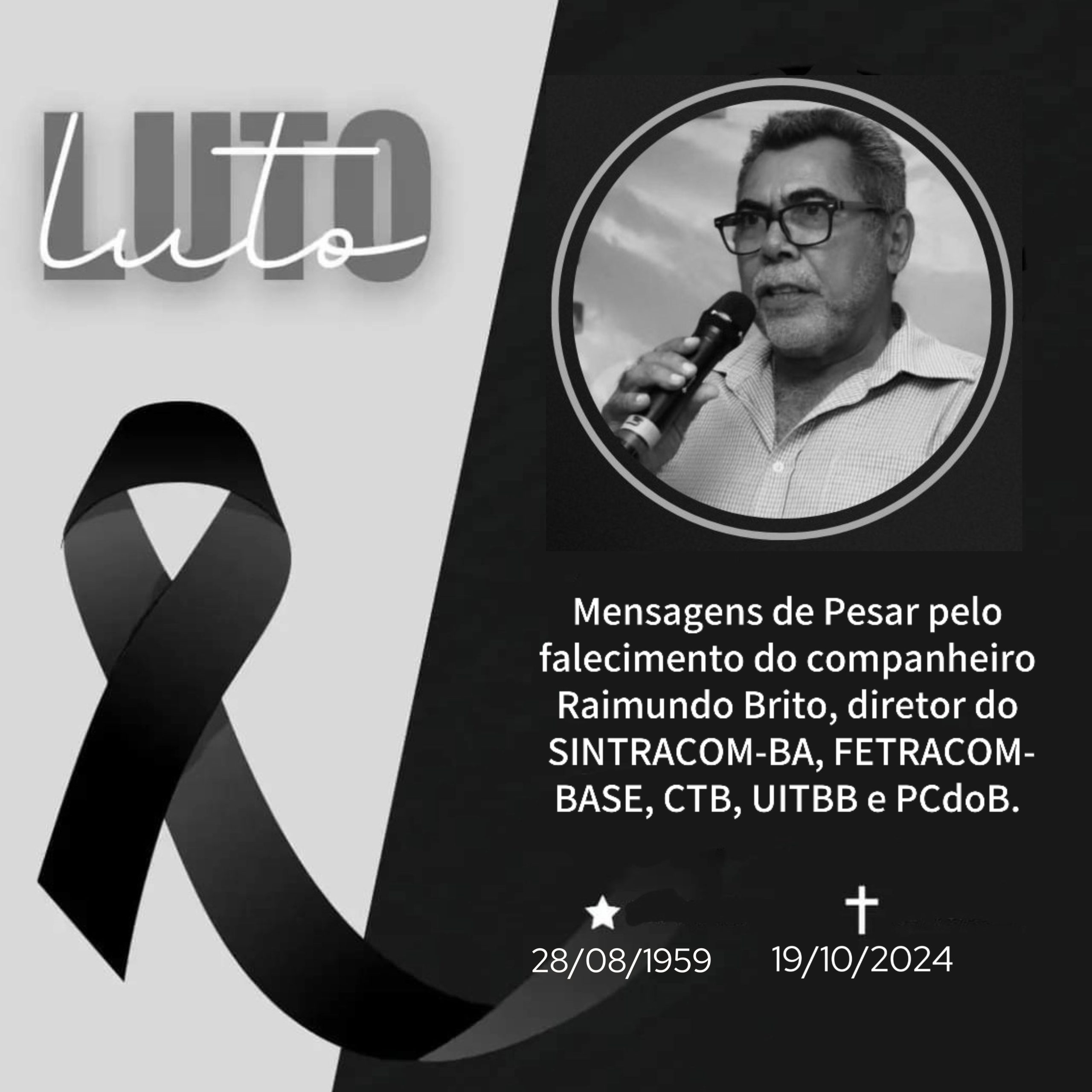 Diretor do SINTRACOM-BA, FETRACOM-BASE, CTB e UITBB, dirigente do PCdoB Salvador, Raimundo Brito era um militante e sindicalista multitarefa, com consciência de classe, amigo leal, companheiro guerreiro, forte e de luta, marido, pai e avô amoroso.