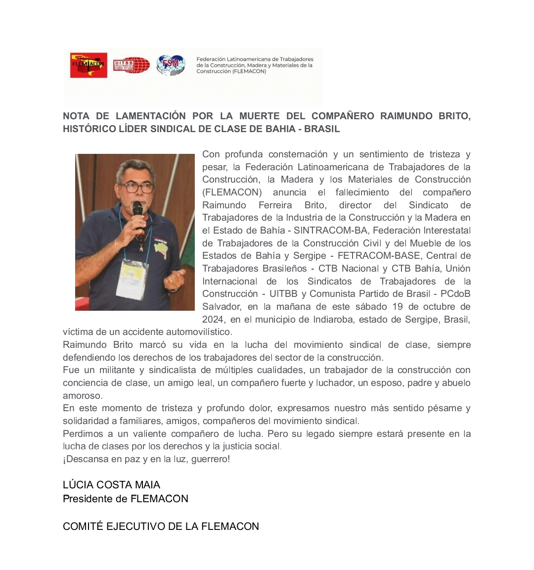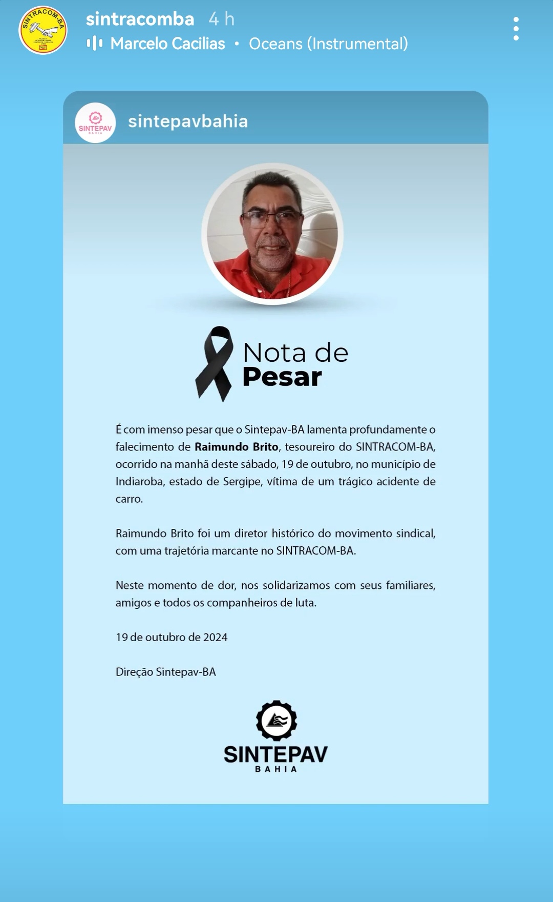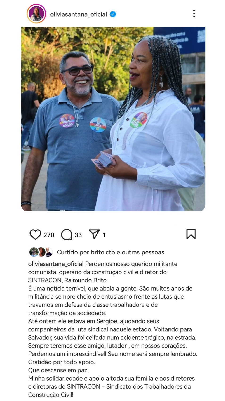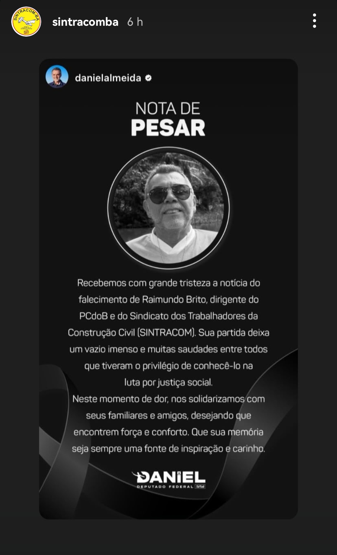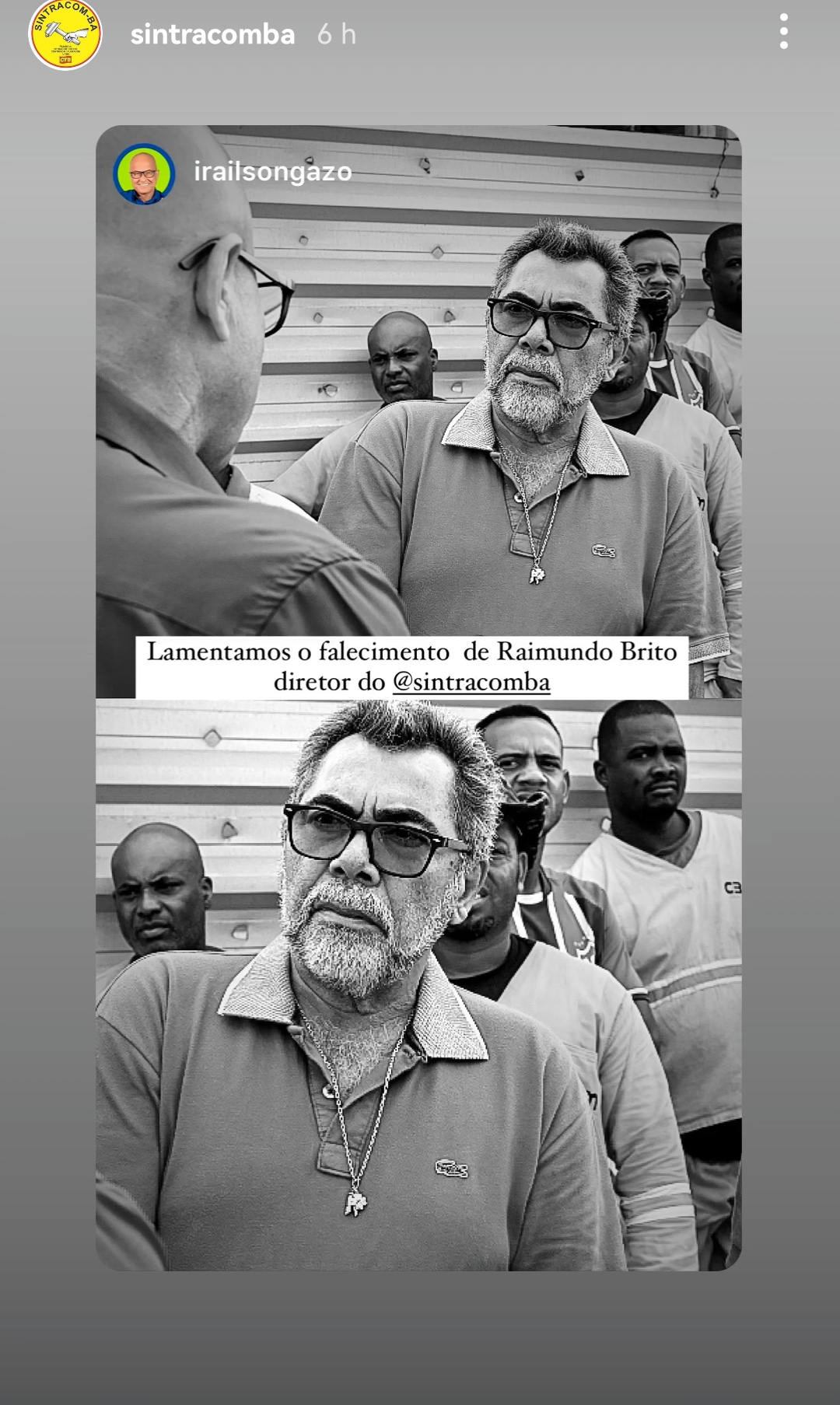 Neste momento de tristeza e profunda dor, expressamos nossa solidariedade aos familiares, amigos, companheiros e companheiras de luta, diretores (as) e funcionários (as) do SINTRACOM-BA.