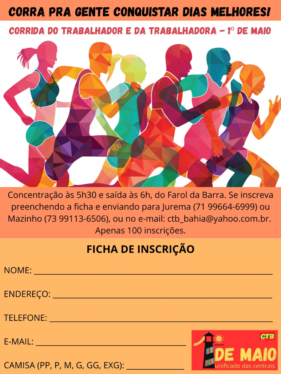 Na próxima quinta-feira, muita reflexão, música, corrida e serviços públicos marcarão o 1º de Maio, Dia Internacional dos Trabalhadores e das Trabalhadoras, em Salvador. O evento unificado das centrais acontecerá a partir das 6h com uma corrida, com saída do Farol da Barra e chegada na praça das Gordinhas, em Ondina. Para participar, preencher a ficha de inscrição e enviar os dados diretamente para o WhatsApp de Jurema (71) 99664-6999 ou e-mail da CTB Bahia: ctb_bahia@yahoo.com.br).