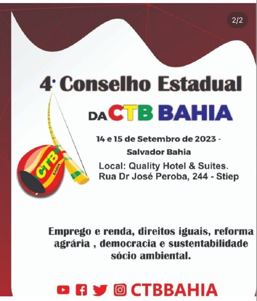 A Central dos Trabalhadores e Trabalhadoras do Brasil da Bahia (CTB-BA), convoca todas as entidades sindicais filiadas a indicarem seus delegados e delegadas para o 4º Conselho Estadual da Central. O evento acontecerá nos dias 14 e 15 de setembro de 2023, no Quality Hotel & Suítes São Salvador (Rua Dr. José Peroba, 244, Stiep, Salvador-Bahia).