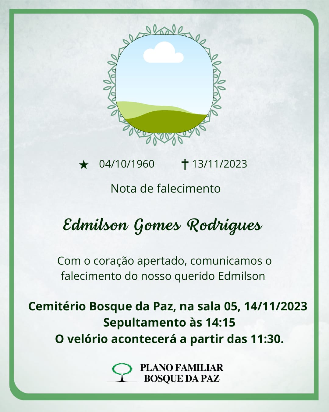 O velório será nesta terça-feira, dia 14/11/2023, a partir das 11h30, na sala 05, no Cemitério Bosque da Paz, Avenida Aliomar Baleeiro. O sepultamento será realizado às 14h15.