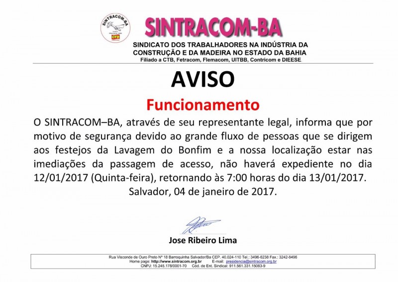 Aviso de Funcionamento – Dia da Lavagem do Bonfim (12/01) by Mery Bahia janeiro 09, 2017 Sem categoria 1084 Avalie esta noticia: 0 votos, 0 avg. rating Compartilhe: POSTAGEM ANTERIOR 2017, o ano da resistência democrática, soberana e classista PRÓXIMA POSTAGEM CTB convoca mobilização no Bonfim: Fé na Luta! Mery Bahia