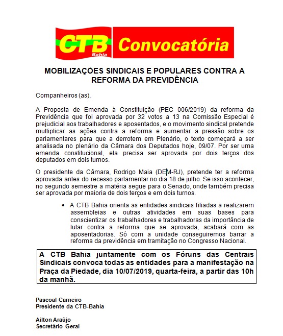 A aprovação do texto-base da reforma da Previdência (PEC 6/19), na Câmara dos Deputados, contou com o apoio de 25 deputados baianos, que traíram os trabalhadores (as).