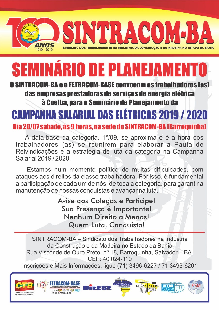 O SINTRACOM-BA e a FETRACOM-BASE convocam os trabalhadores (as) das empresas prestadoras de serviços de energia elétrica à Coelba, para o Seminário de Planejamento da Campanha Salarial das Elétricas 2019 / 2020.