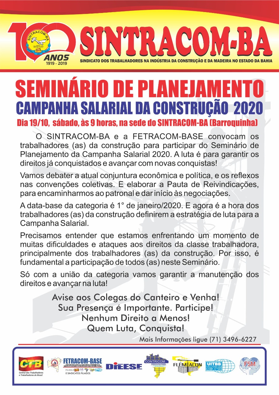 Neste sábado, dia 19/10, às 9 horas, no auditório da sede do Sindicato, na Barroquinha. O SINTRACOM-BA e a FETRACOM-BASE convocam os trabalhadores (as) da construção para participar do Seminário de Planejamento da Campanha Salarial 2020. A luta é para garantir os direitos já conquistados e avançar com novas conquistas!