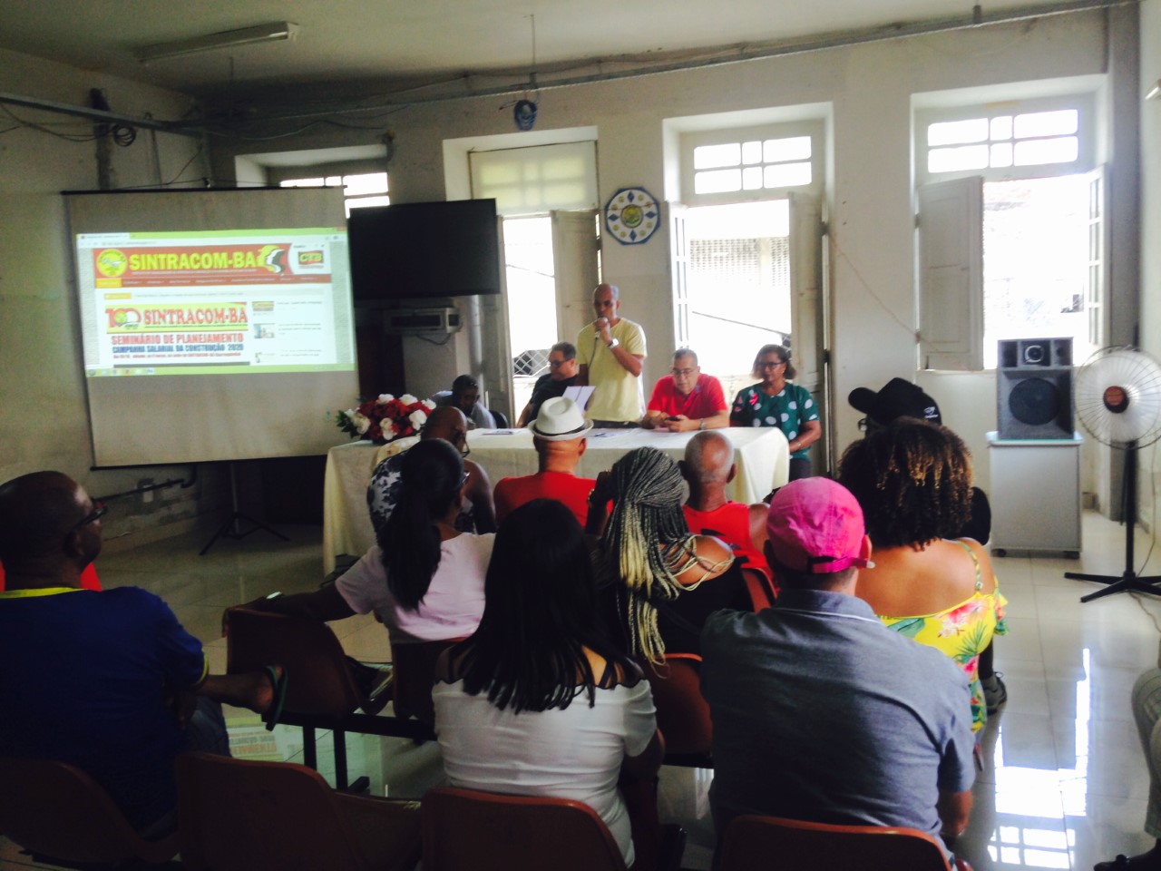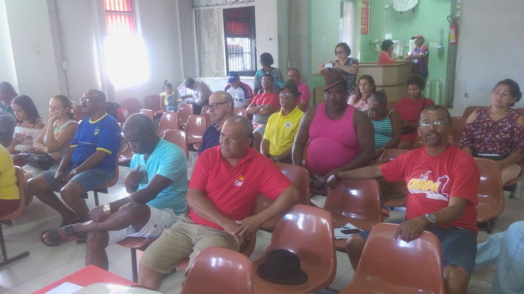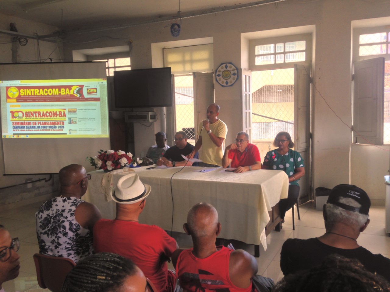 A mesa de abertura teve a seguinte composição: presidente do SINTRACOM-BA, Carlos Silva; presidente da FETRACOM-BASE, Edson Cruz; 2º secretário, José Ribeiro; diretora de Mulheres, Ednalva Bispo; e Everaldo Augusto, representante da Secretaria Estadual do Trabalho, Emprego, Renda e Esportes; que convocaram os trabalhadores (as) a se unirem ao Sindicato e à Federação nas lutas da Campanha Salarial 2020.