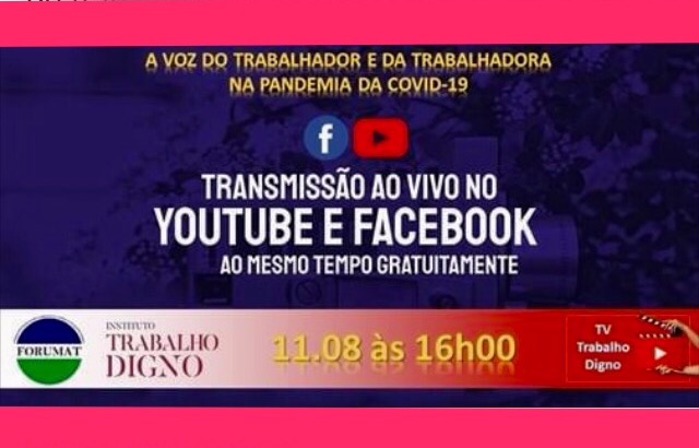 O Fórum de Proteção ao Meio Ambiente do Trabalho – FORUMAT e o Instituto Trabalho Digno realizaram duas “lives”, com transmissão de vídeos, nos dias 11 e 13/08, destacando o tema “Saúde, Segurança e Prevenção durante a pandemia”, com debates e relatos sobre a situação do trabalho durante a Pandemia da Covid-19.