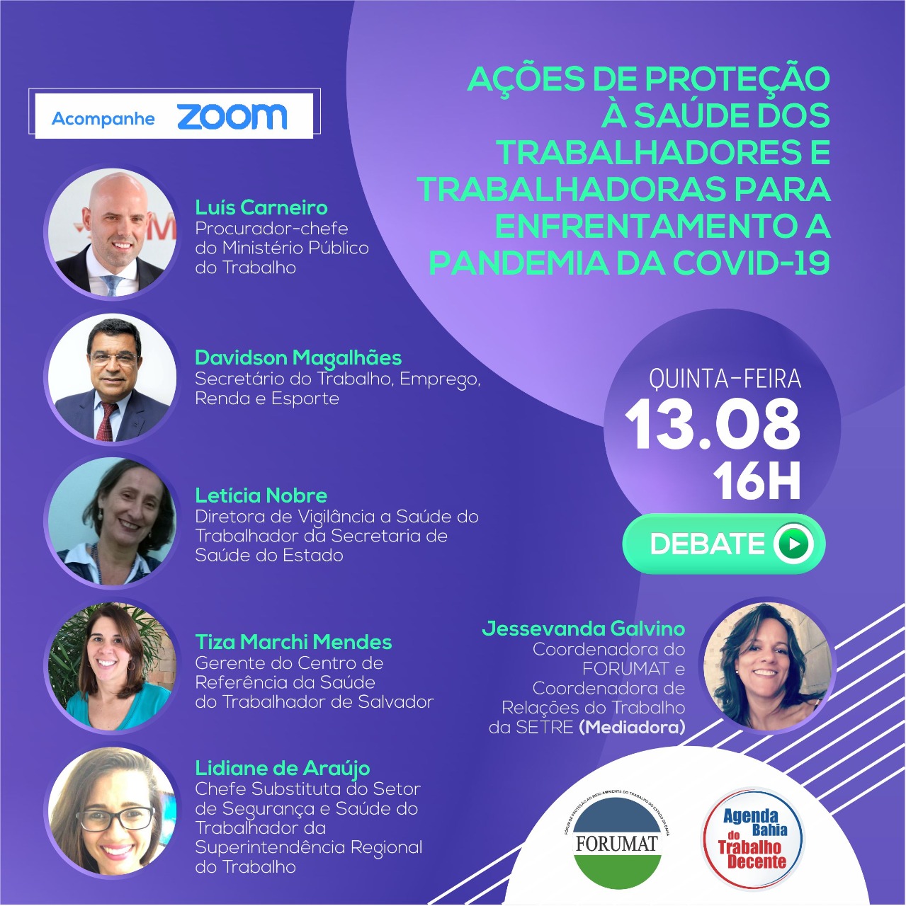 A segunda live teve a participação do procurador-chefe do MPT Luís Carneiro, do secretário do Trabalho, Emprego, Renda e Esportes Davidson Magalhães, da diretora de Segurança e Saúde do Trabalhador da Secretaria de Saúde do Estado Letícia Nobre, da gerente do Centro de Referência da Saúde do Trabalhador de Salvador Tiza Marchi Mendes, da chefe substituta de Segurança e Saúde do Trabalhador da Superintendência Regional do Trabalho Lidiane de Araújo, com mediação de Jessevanda Galvino, coordenadora do FORUMAT e coordenadora de Relações do Trabalho, da Setre.