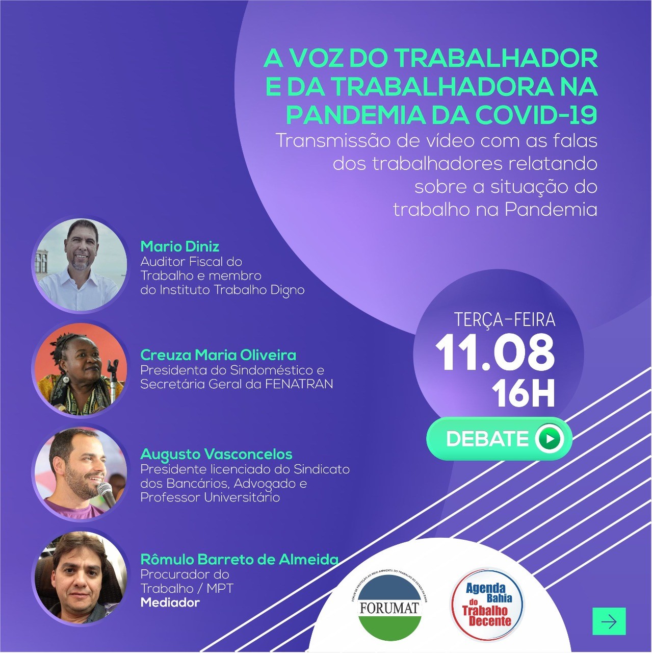 A primeira Live foi muito boa e aconteceu na última terça-feira, dia 11, com a participação de Mário Diniz, auditor fiscal do Trabalho, Creuza Maria Oliveira, presidenta do Sindoméstico e diretora da Fenatran, Augusto Vasconcelos, presidente licenciado do Sindicato dos Bancários, e mediação de Rômulo Barreto de Almeida, procurador do Trabalho (Ministério Público do Trabalho).