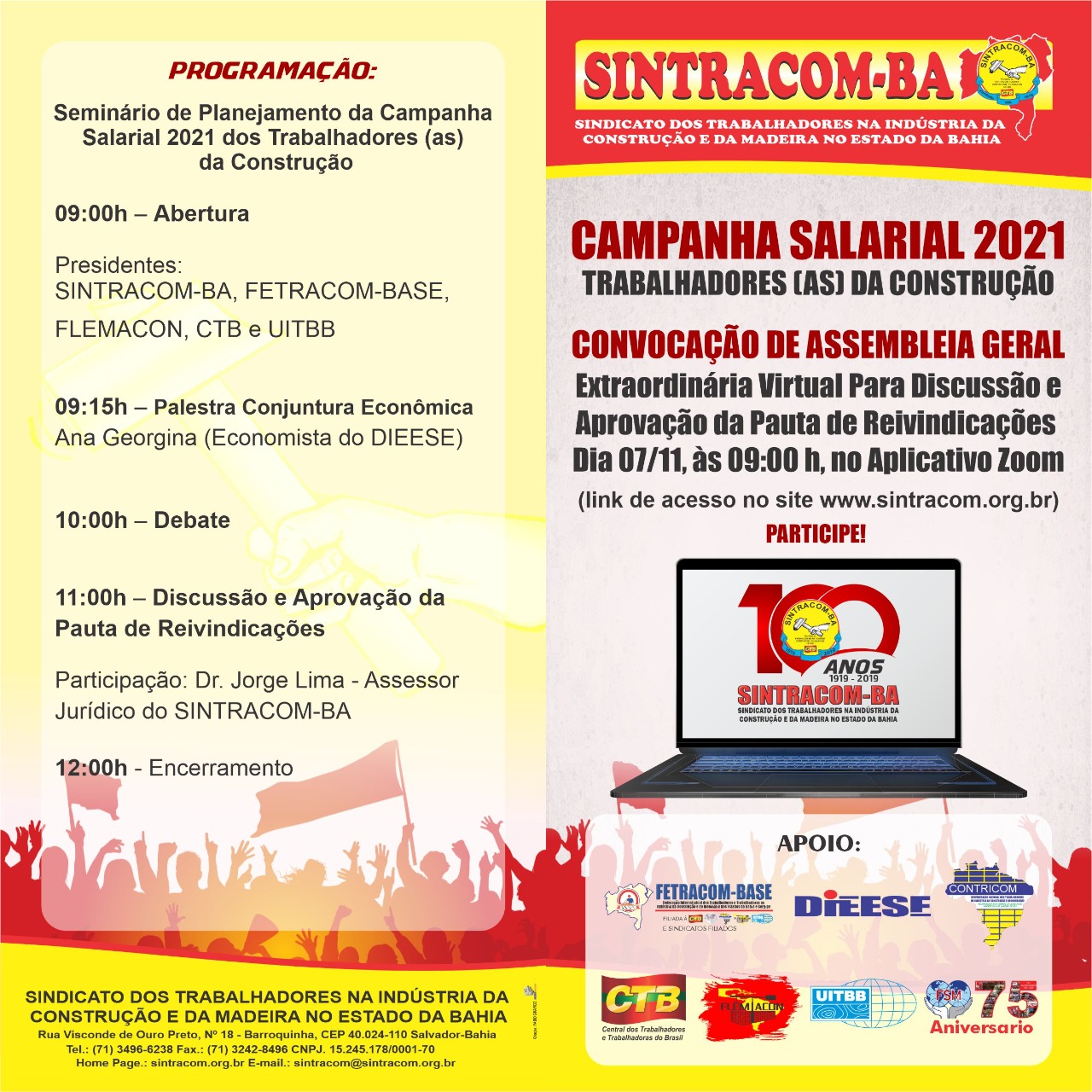 Na manhã do último sábado, dia 07/11, o Sintracom-BA realizou, através do aplicativo Zoom com transmissão ao vivo pelo Facebook, a Assembleia Geral Virtual e o Seminário de Planejamento da Campanha Salarial 2021 dos Trabalhadores da Construção.
