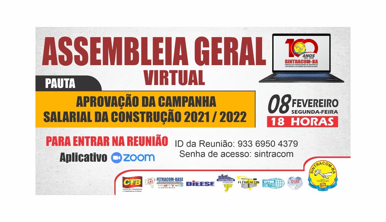 Nesta segunda-feira, dia 08/02, às 18 horas, tem Assembleia Geral Extraordinária Virtual do SINTRACOM-BA, no aplicativo Zoom. É para discutir a proposta de acordo da Campanha Salarial dos Trabalhadores (as) da Construção 2021.
