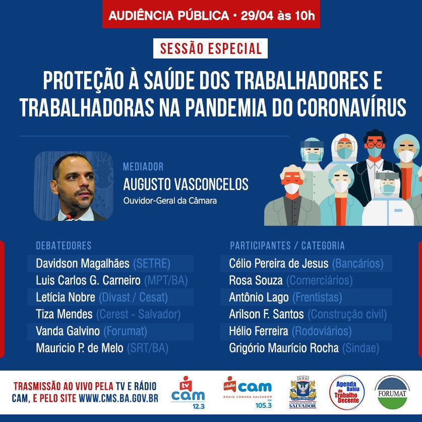 O diretor de Saúde e Segurança no Trabalho do SINTRACOM-BA, Arilson Ferreira dos Santos, participa nesta quinta-feira, dia 29/04, às 10 horas, de Sessão Especial com o tema “Proteção à Saúde dos Trabalhadores e Trabalhadoras, na Pandemia do Coronavírus”.