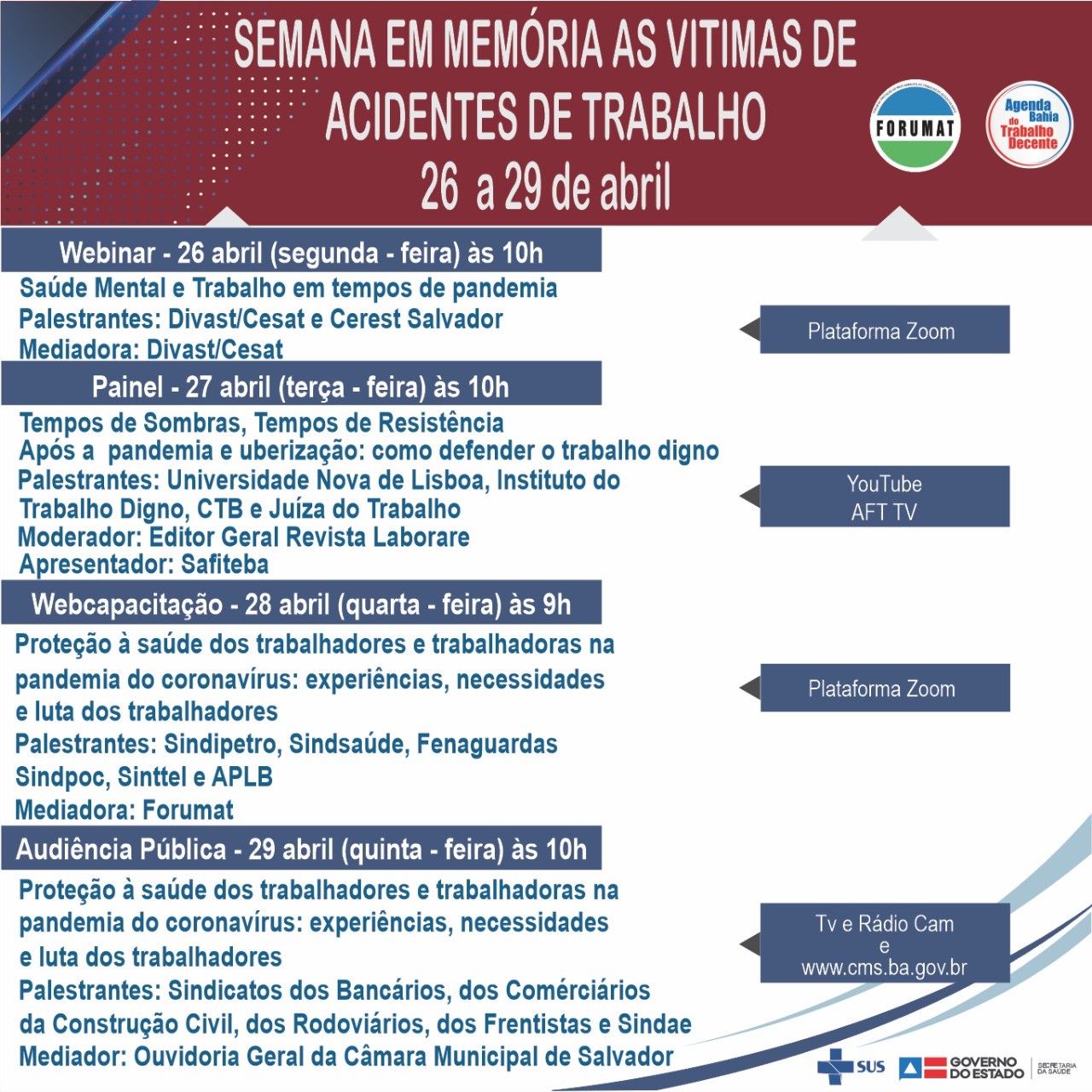 O evento faz parte da programação organizada pelo Forumat e Agenda Bahia do Trabalho Decente, para marcar o Dia Mundial em Memória das Vítimas de Acidentes do Trabalho e Doenças Ocupacionais, 28 de abril.