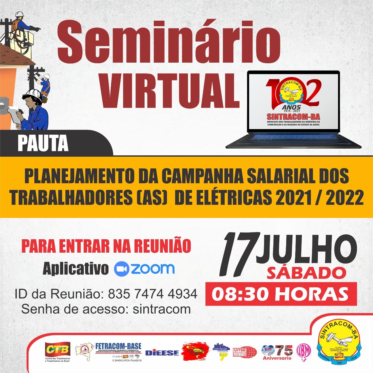 A Diretoria do SINTRACOM-BA convoca todos os trabalhadores (as) para participar do Seminário Virtual de Planejamento da Campanha Salarial 2021 / 2022 e Assembleia Geral, no dia 17/07 (sábado), às 08:30h, através do aplicativo Zoom, acesso pelo site www.sintracom.org.br. Participe!