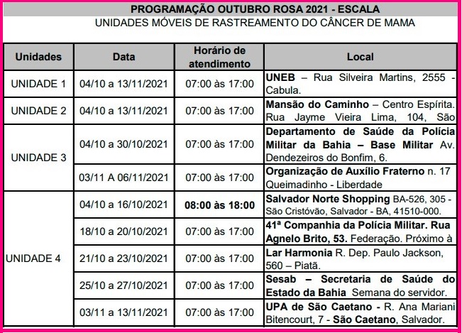 Em Salvador, as mamografias serão ofertadas em unidades móveis e no Centro Estadual de Oncologia (Cican). Já no interior, as 21 policlínicas regionais de saúde ofertarão os exames, e o agendamento ocorre nos postos de saúde ou nas secretarias municipais de Saúde.