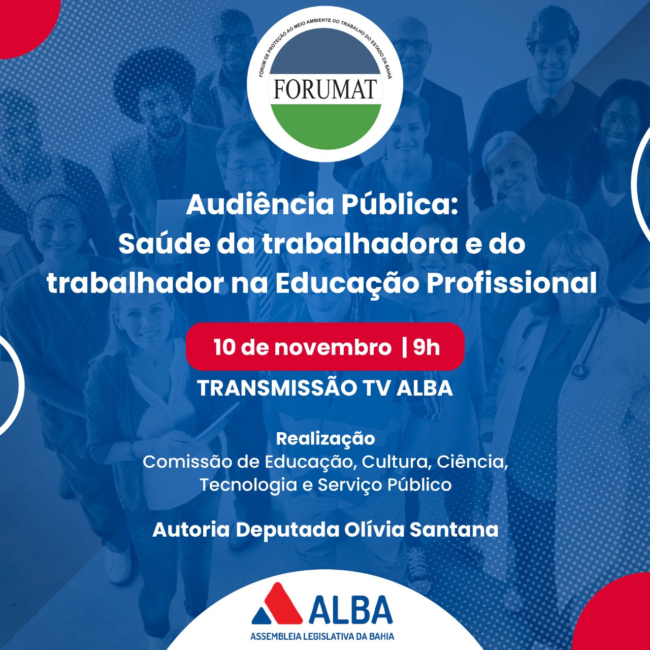 Nesta quarta-feira, 10/11, às 9h, tem audiência pública remota sobre o tema “Saúde e Segurança das Trabalhadoras e dos Trabalhadores na Educação Profissional do Estado da Bahia”. Participe!