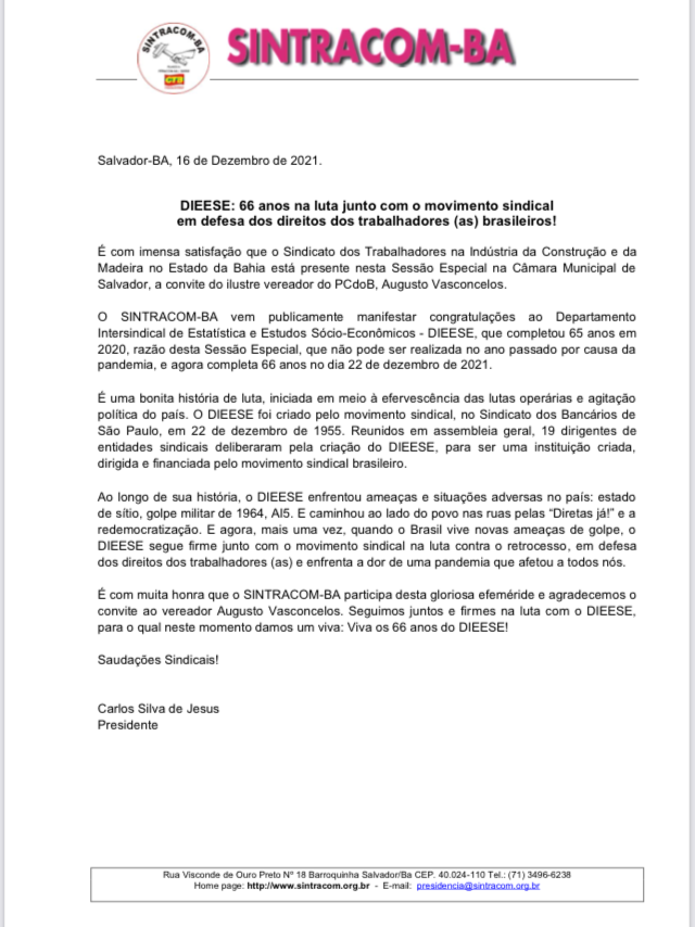 Leia a Nota do Sintracom-BA saudando os 66 anos do Dieese e participe da Sessão Especial “Em comemoração aos 65 anos da DIEESE”, que acontece hoje, através da internet.