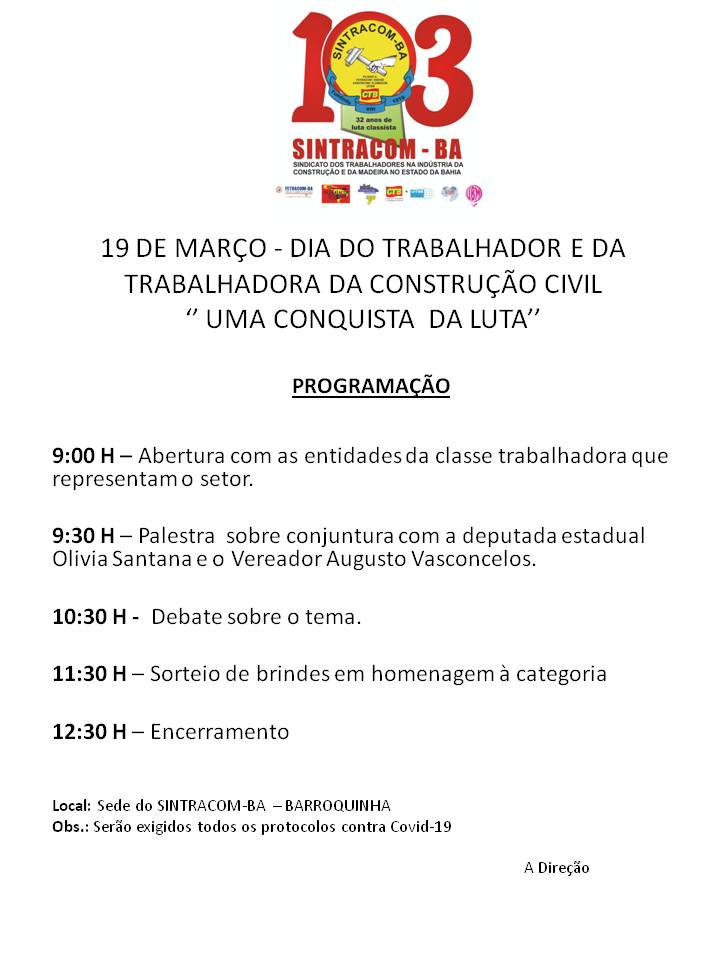 Um dos mais antigos sindicatos criados no Brasil, fundado em 19 de março de 1919, o Sindicato dos Trabalhadores na Indústria da Construção e da Madeira no Estado da Bahia – Sintracom-BA comemora neste sábado (19/03), às 9 horas, em sua sede, na Barroquinha, os 103 anos da entidade da entidade e o Dia dos Trabalhadores da Construção, feriado da categoria. A programação inclui palestra da deputada estadual Olívia Santana sobre o tema e sorteio de brindes. Serão exigidos os protocolos de prevenção contra a covid-19: uso de máscara e cartão de vacinação.