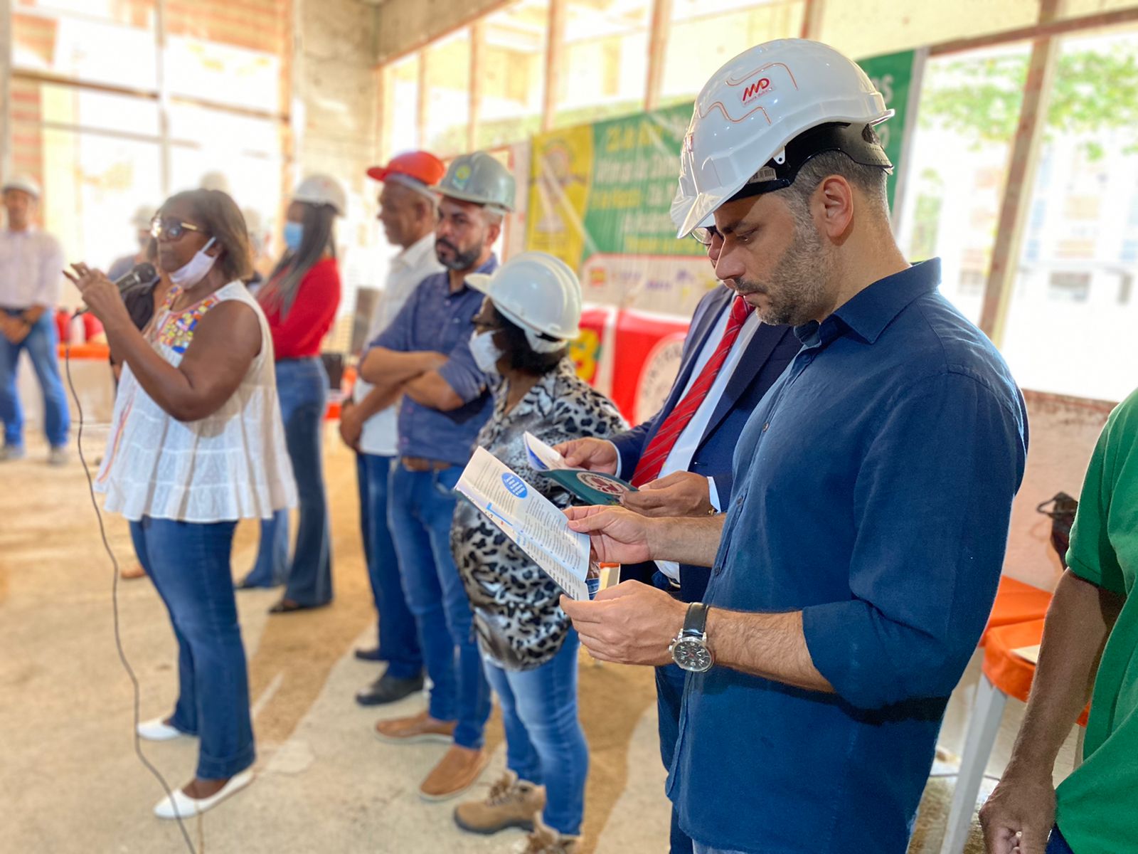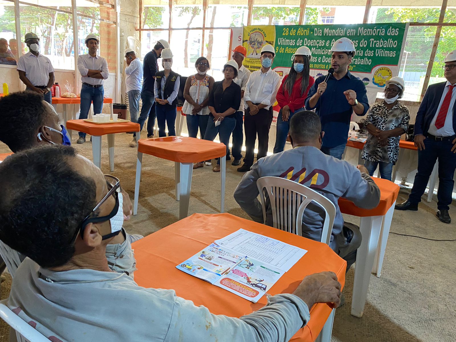 Ato promovido pelo SINTRACOM-BA, em 28 de abril, Dia em Memória às Vítimas de Acidentes e Doenças do Trabalho, que aconteceuy no canteiro de obras do Ocean Residence, da MD Engenharia, em Ondina, com a presença do diretor de Saúde e Segurança Arilson Ferreira e os demais diretores, deputada estadual Olívia Santana e vereador Augusto Vasconcelos (ambos do PCdoB), representantes da SRTE, do MPT, da Secretaria Estadual do Trabalho, dentre outros.
