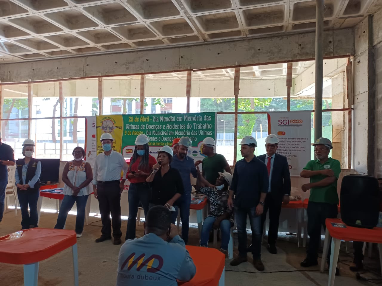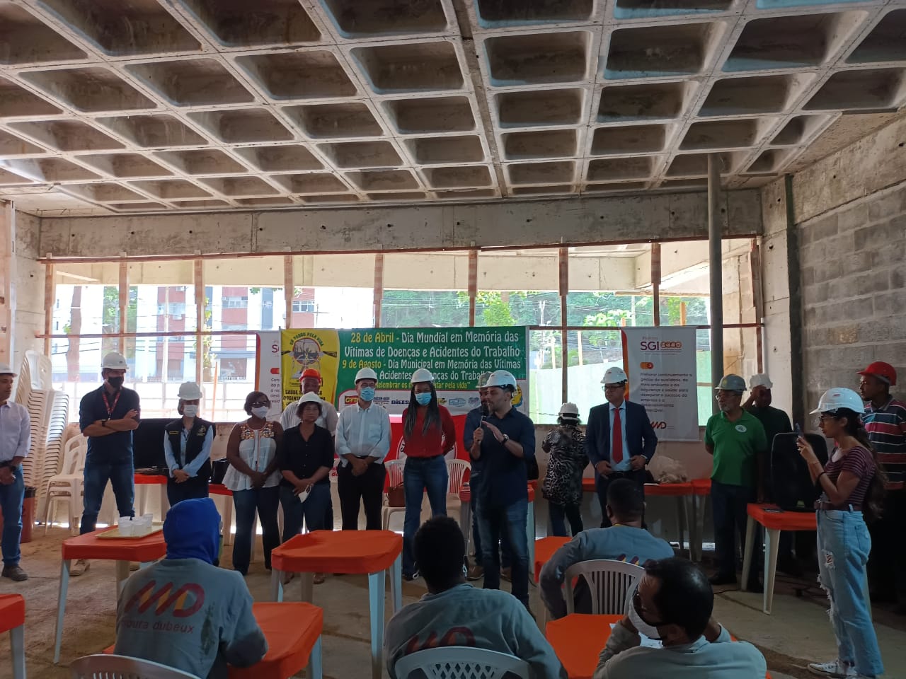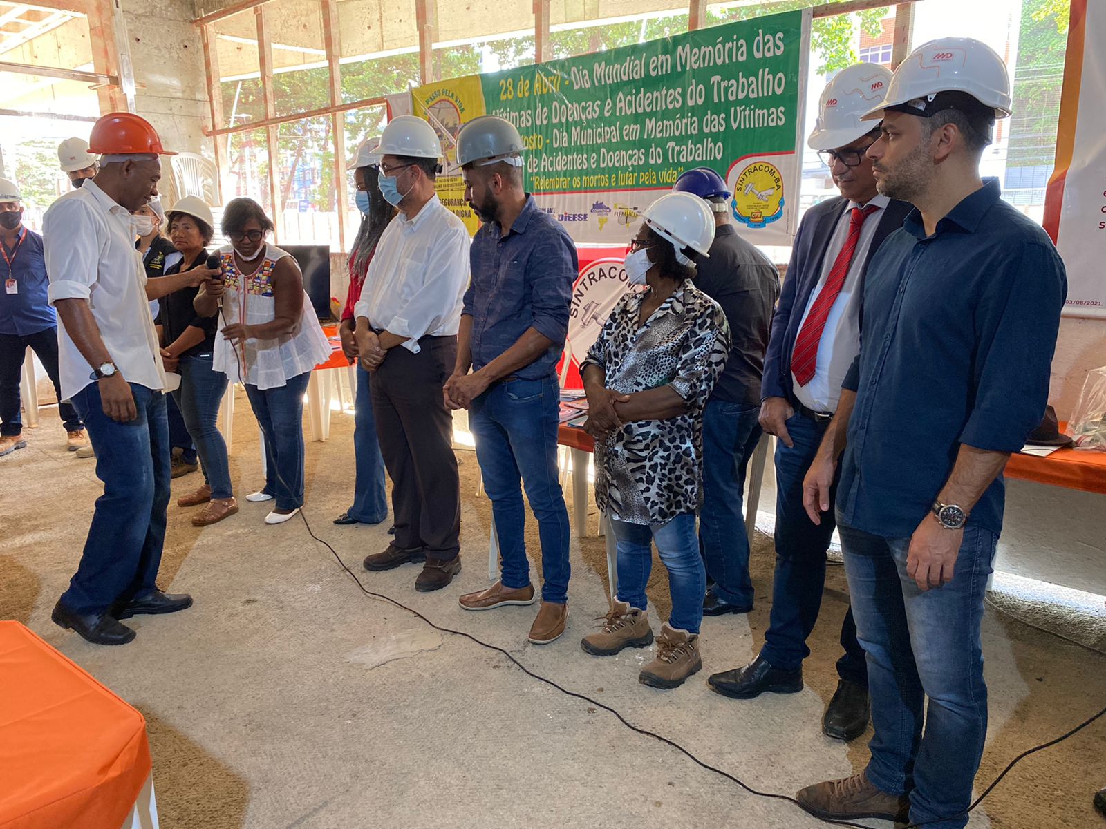 Ato promovido pelo SINTRACOM-BA, em 28 de abril, Dia em Memória às Vítimas de Acidentes e Doenças do Trabalho, que aconteceuy no canteiro de obras do Ocean Residence, da MD Engenharia, em Ondina, com a presença do diretor de Saúde e Segurança Arilson Ferreira e os demais diretores, deputada estadual Olívia Santana e vereador Augusto Vasconcelos (ambos do PCdoB), representantes da SRTE, do MPT, da Secretaria Estadual do Trabalho, dentre outros.