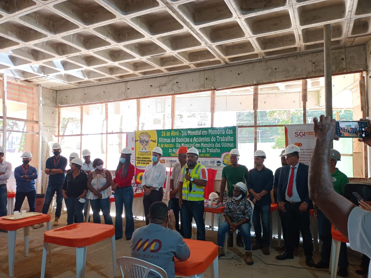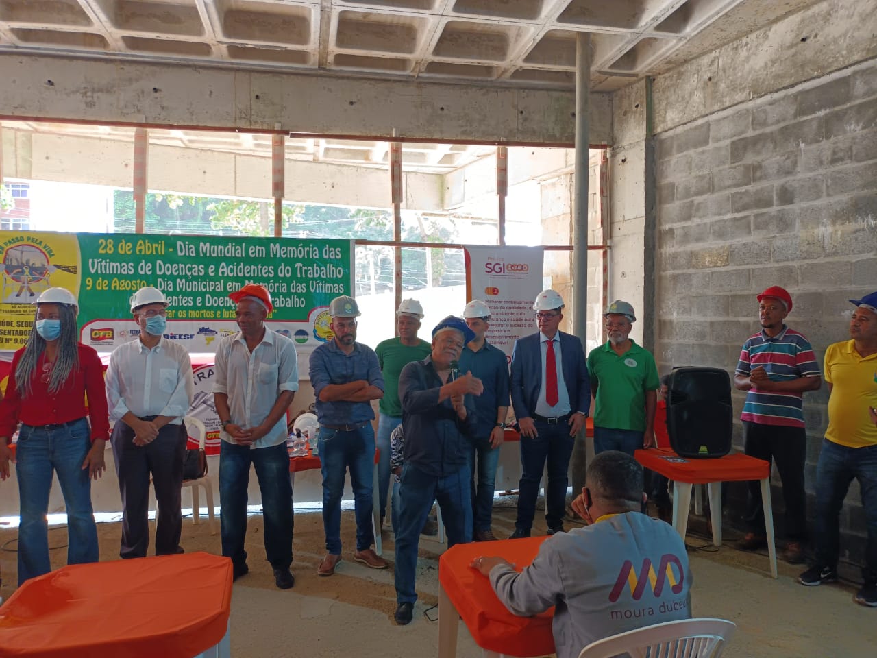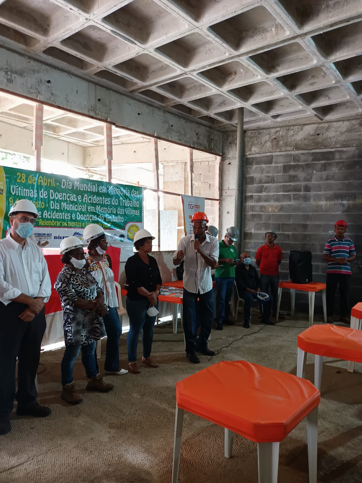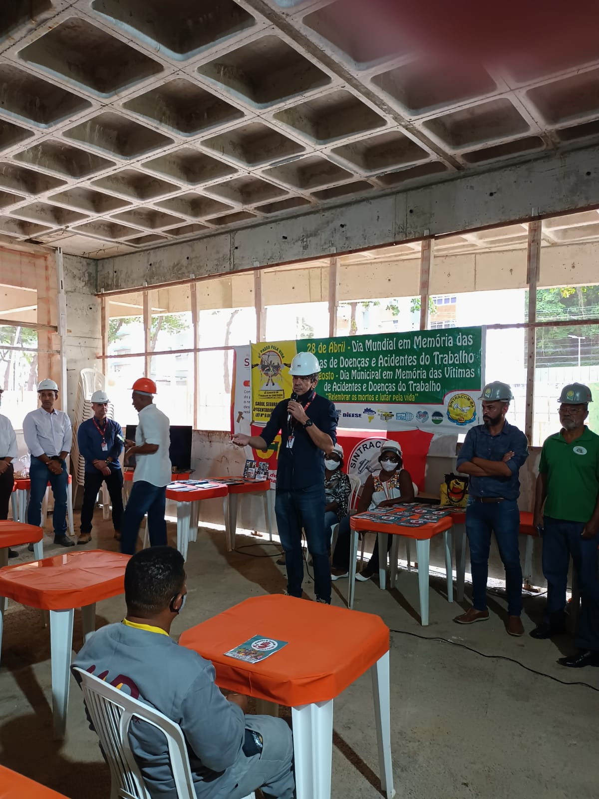 Ato promovido pelo SINTRACOM-BA, em 28 de abril, Dia em Memória às Vítimas de Acidentes e Doenças do Trabalho, que aconteceuy no canteiro de obras do Ocean Residence, da MD Engenharia, em Ondina, com a presença do diretor de Saúde e Segurança Arilson Ferreira e os demais diretores, deputada estadual Olívia Santana e vereador Augusto Vasconcelos (ambos do PCdoB), representantes da SRTE, do MPT, da Secretaria Estadual do Trabalho, dentre outros.