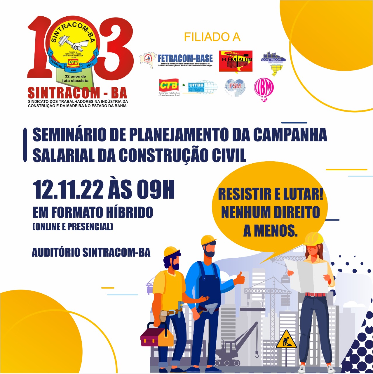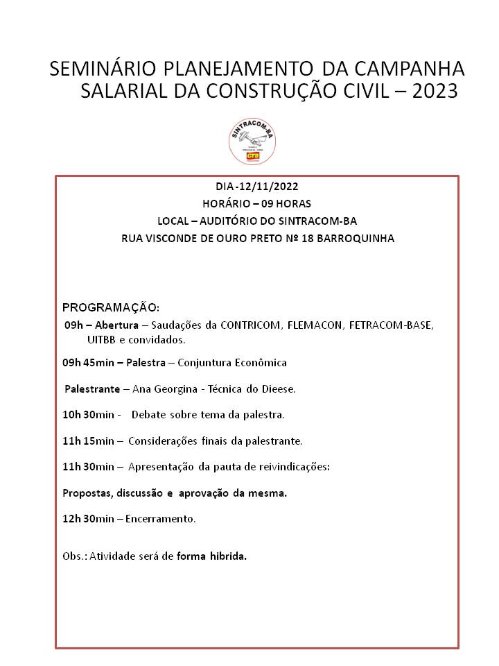Neste sábado, 12/11, a partir das 09 horas, tem Seminário de Planejamento da Campanha Salarial dos Trabalhadores (as) da Construção 2023, no auditório da sede do SINTRACOM-BA, Rua Visconde de Ouro Preto, 18, Barroquinha.