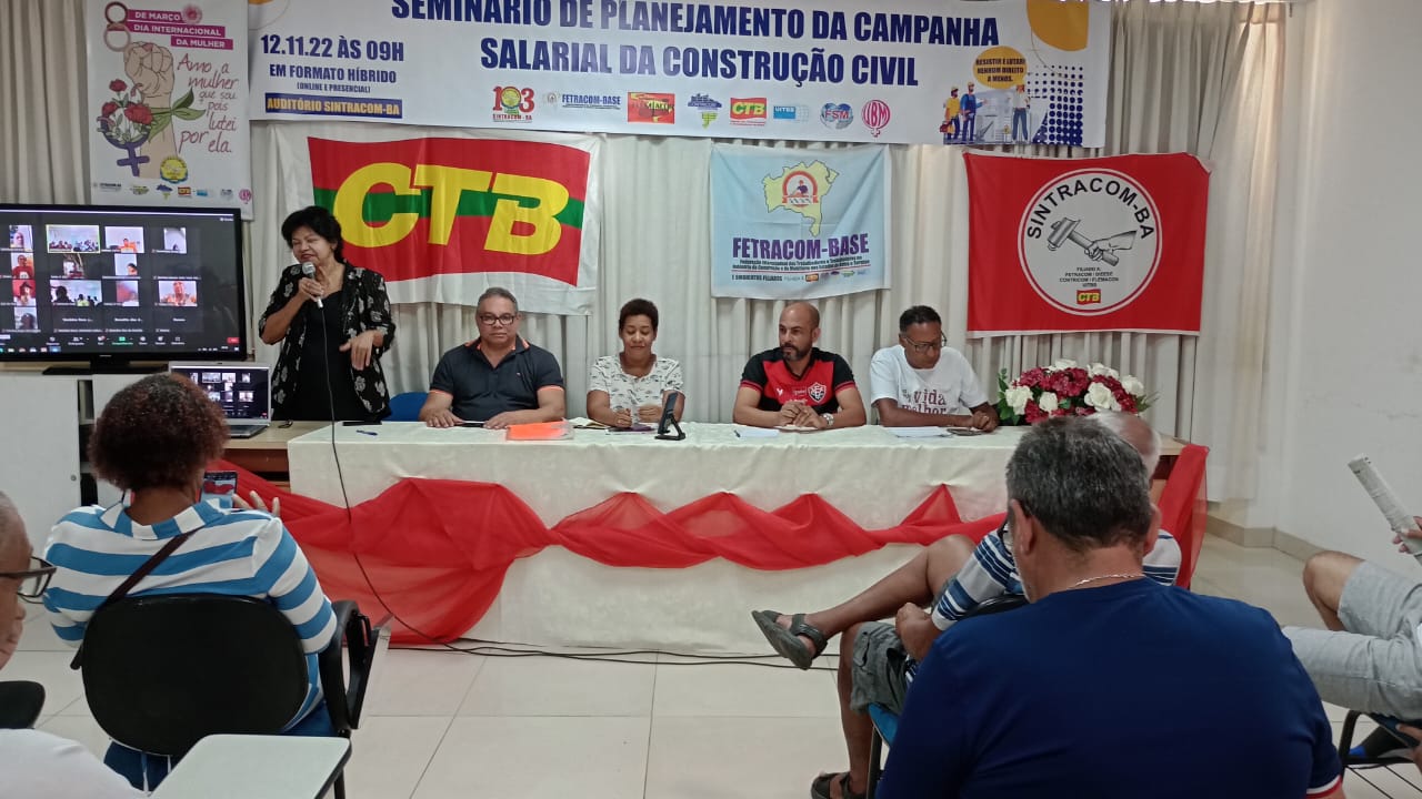Na manhã do último sábado, 12/11, o Sintracom-BA e a Fetracom-Base reuniram diretores (as) e trabalhadores (as), no auditório da sede do Sindicato, em Salvador, no Seminário de Planejamento da Campanha Salarial 2023 dos Trabalhadores (as) da Construção. O evento foi presencial e virtual.