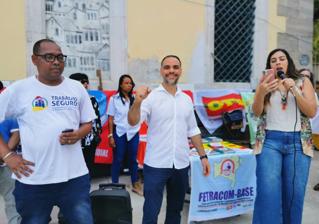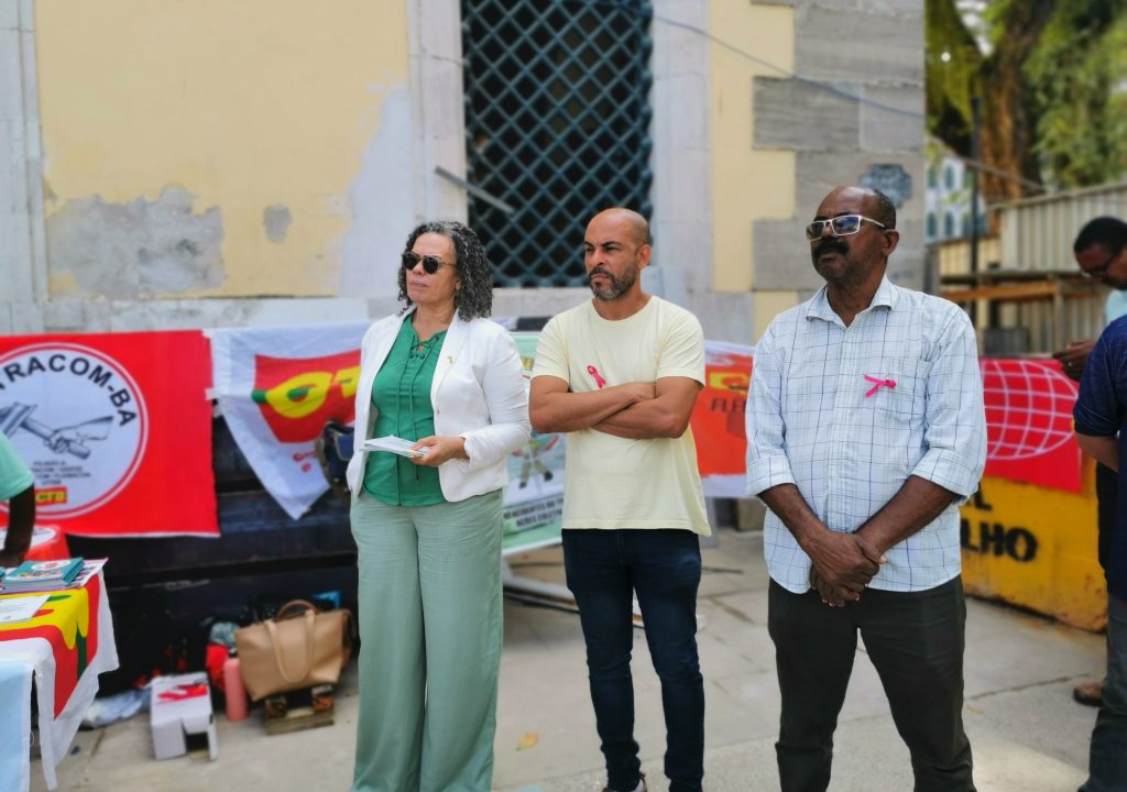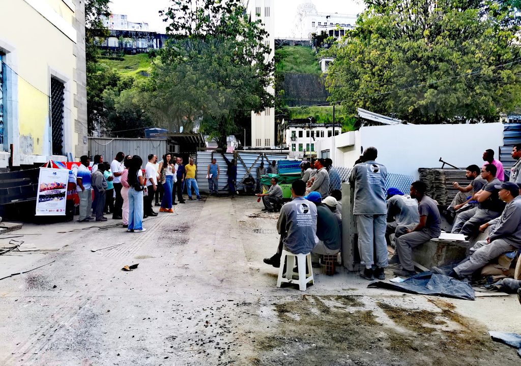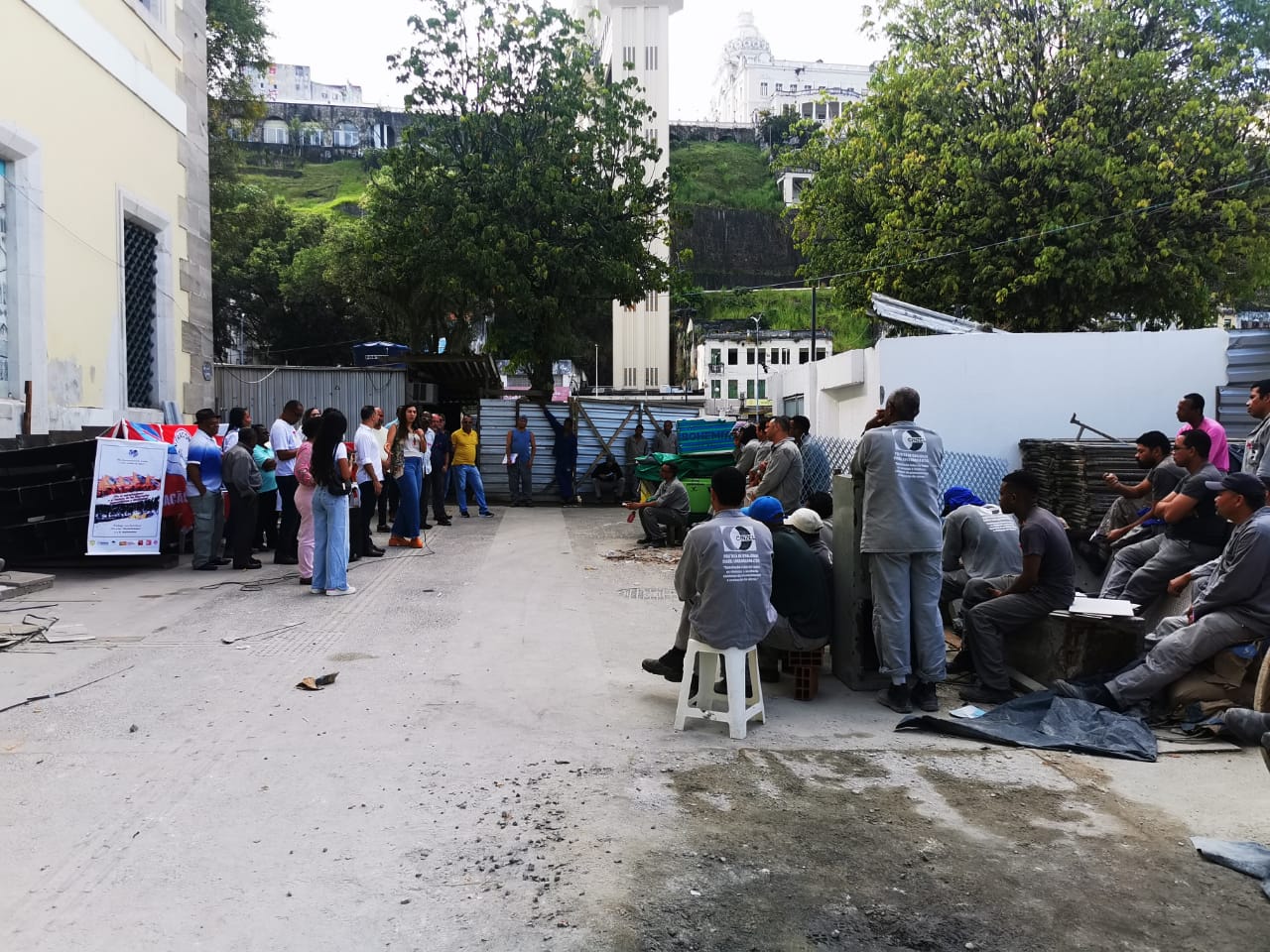 Atividade sobre saúde e segurança reuniu trabalhadores (as) para marcar os 78 anos da FSM, com Dia de Ação promovido pelo SINTRACOM-BA, FETRACOM-BASE, CTB, FLEMACON e entidades filiadas, nesta terça-feira, dia 03/10, em canteiro de obras da Cinzel, no Mercado Modelo, em Salvador.