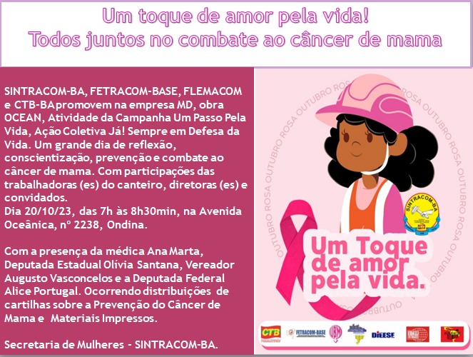Com o tema “Um toque de amor pela vida – Todos (as) juntos no combate ao câncer de mama”, será realizado um dia de reflexão, conscientização, prevenção e combate ao câncer de mama, com a participação das trabalhadoras (es), diretoras (es), e convidados.