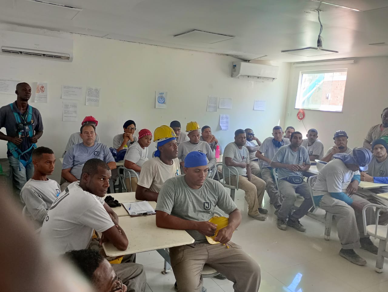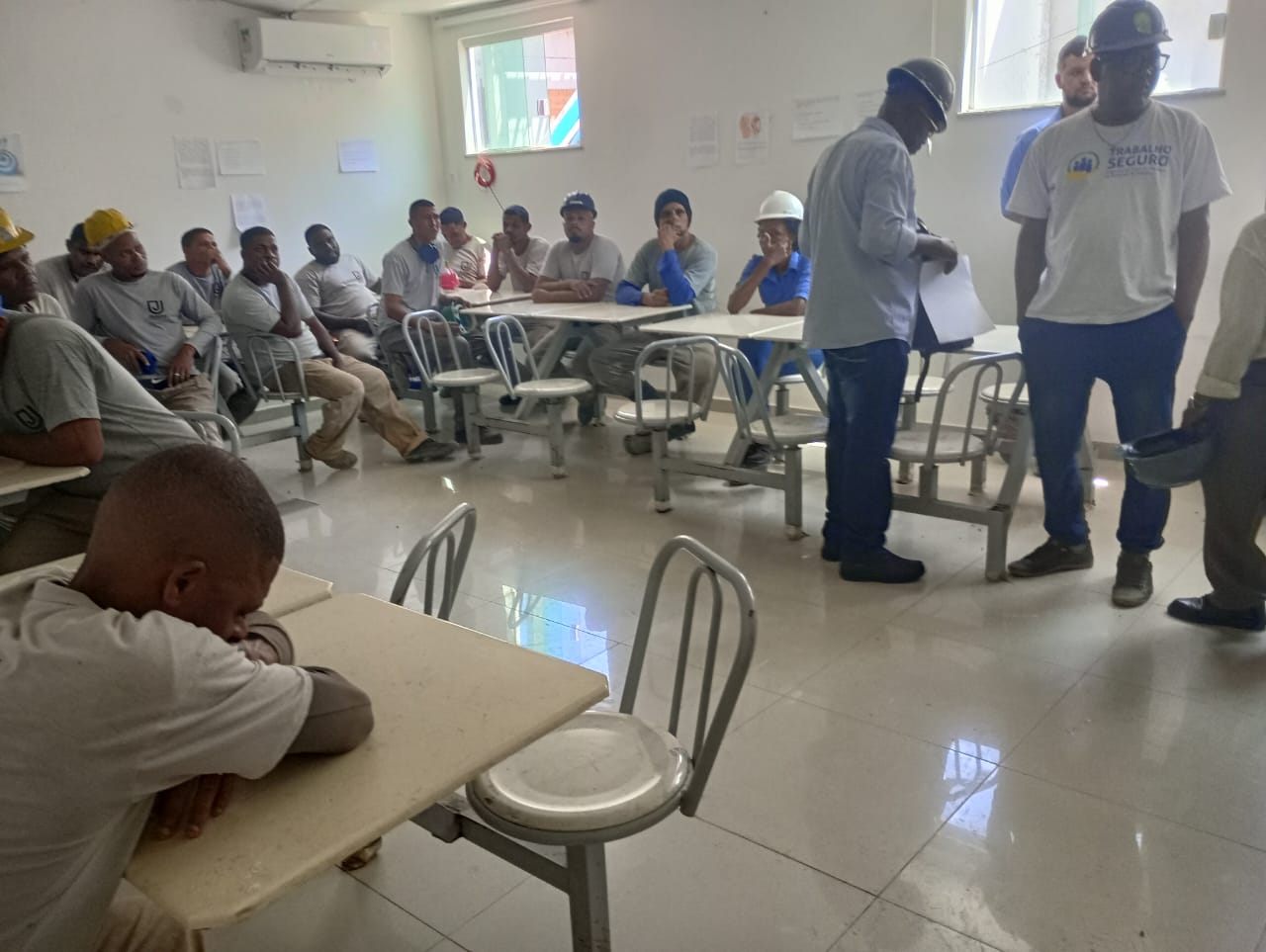 No canteiro da empresa, Arilson conversou com os trabalhadores (as) e realizou um Diálogo Diário de Segurança (DDS) para falar sobre o acidente de trabalho que provocou a morte do trabalhador e a necessidade das empresas promoverem ações coletivas de saúde e segurança no trabalho para seus empregados.