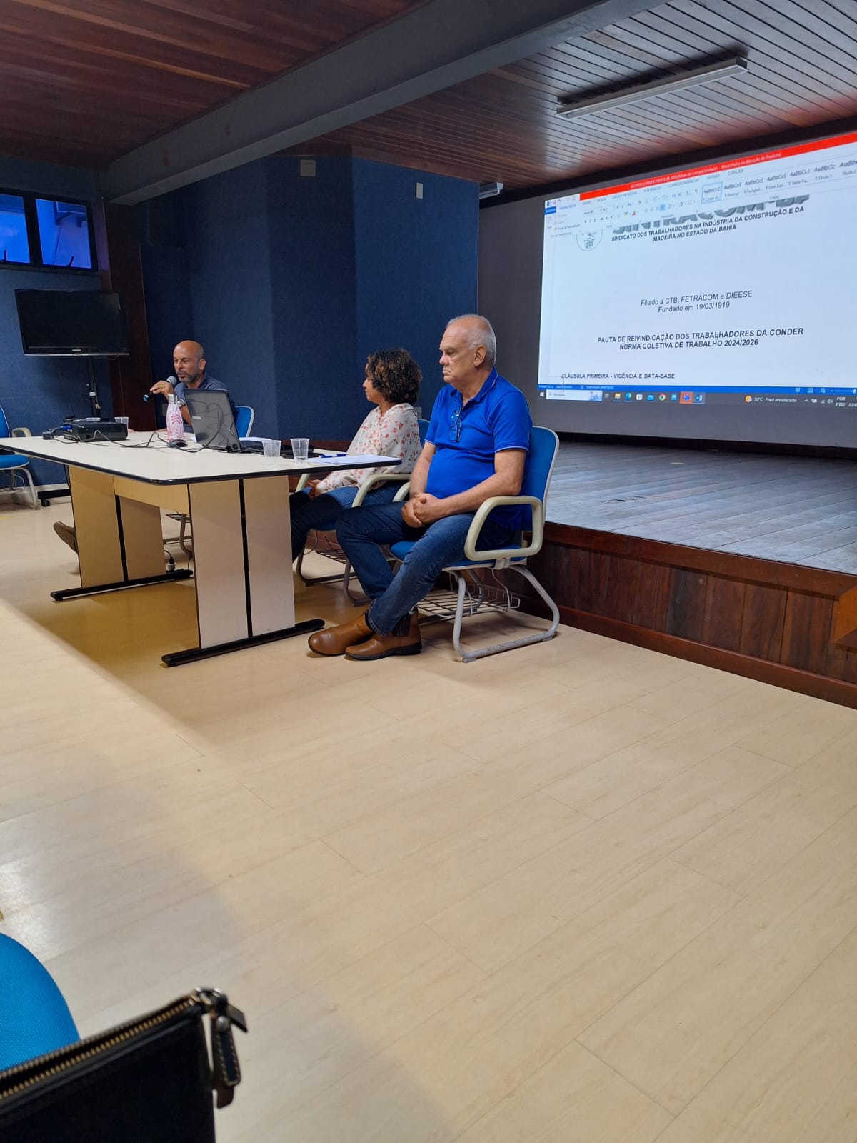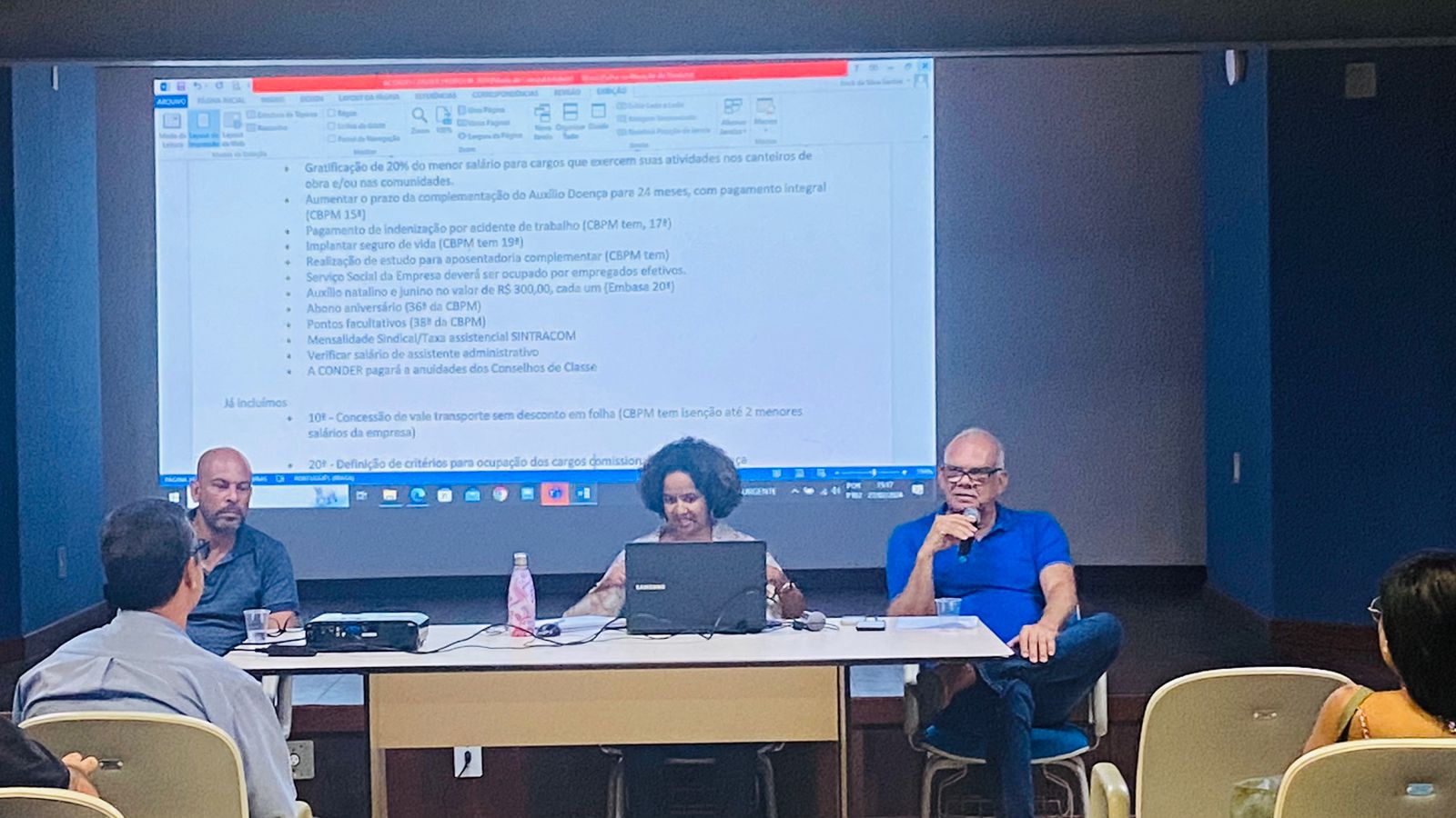 A diretora do SINTRACOM-BA e funcionária da CONDER, Daniela Cerqueira, fez a abertura da assembleia e leu o edital. Em seguida, o presidente da ASCON, José Augusto Azevedo Pinto, apresentou a proposta da pauta de reivindicações, juntamente com Daniela.