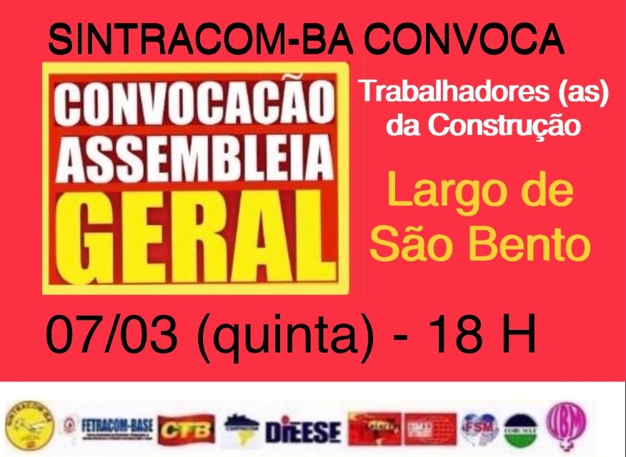 O SINTRACOM-BA e a FETRACOM-BASE convocam os trabalhadores e trabalhadoras da construção para a ASSEMBLEIA GERAL, NESTA QUINTA-FEIRA, DIA 07/03, ÀS 18 HORAS, NO LARGO DE SÃO BENTO.