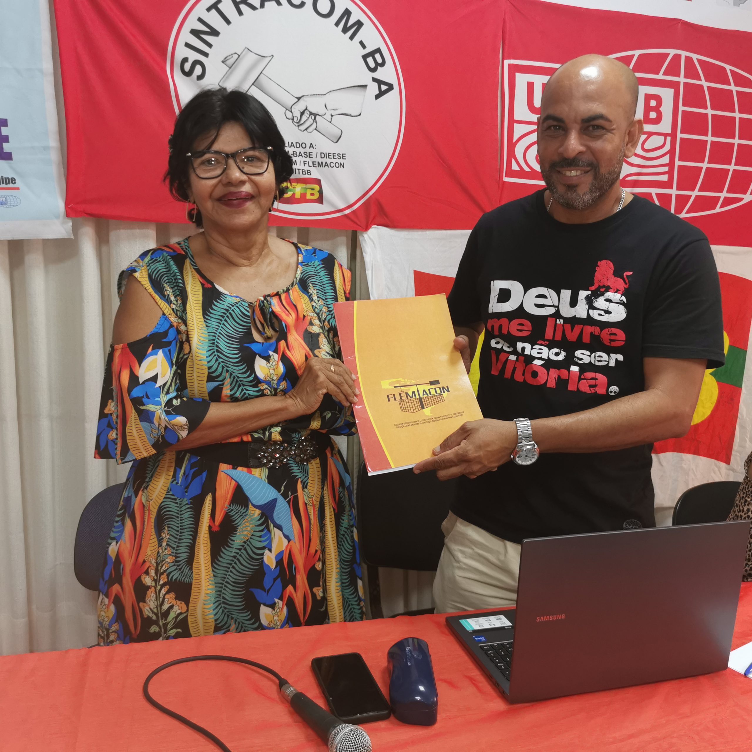 Lúcia Maia, presidenta da FLEMACON, destacou a importância da história de lutas do SINTRACOM-BA e que é um orgulho para a entidade que preside, a Federação Latino-americana e Caribenha da categoria, ter o Sindicato como filiado. A sindicalista leu e entregou ao presidente Carlos Silva um documento saudando os 105 anos do SINTRACOM-BA, encaminhado pelo Comité Ejecutivo de la FLEMACON.