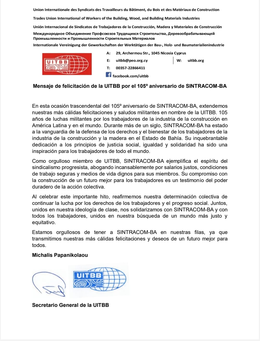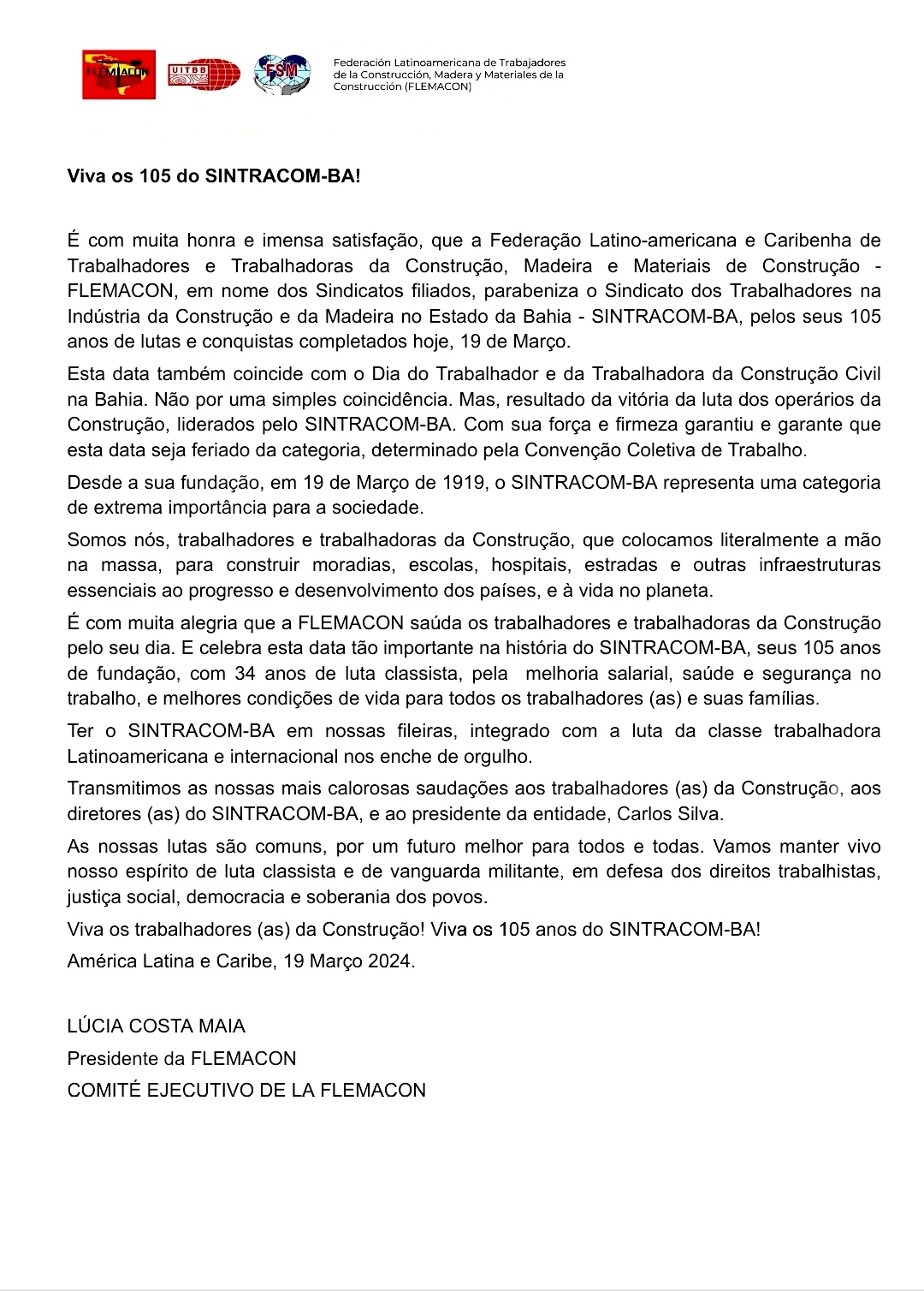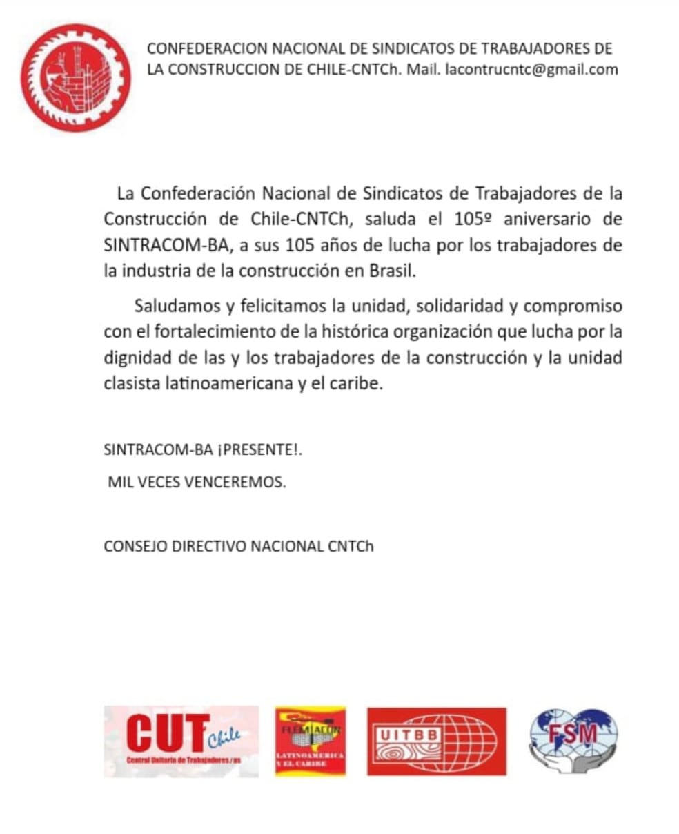 Veja abaixo as mensagens de felicitações que o SINTRACOM-BA recebeu pela passagem dos seus 105 anos de fundado, completados no dia 19 de Março de 2024.