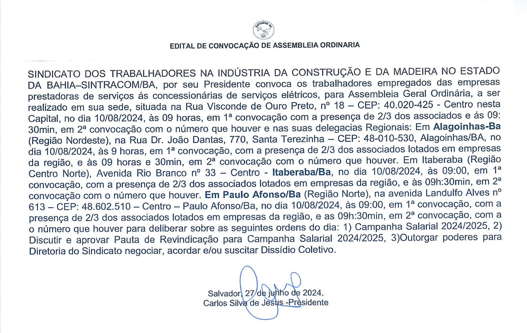 SINDICATO DOS TRABALHADORES NA INDÚSTRIA DA CONSTRUÇÃO E DA MADEIRA NO ESTADO DA BAHIA – SINTRACOM/BA, por seu Presidente convoca os trabalhadores empregados das empresas prestadoras de serviços ás concessionárias de serviços elétricos, para Assembleia Geral Ordinária, a ser realizado em sua sede, situada na Rua Visconde de Ouro Preto, nº 18 – CEP: 40.020-425 – Centro nesta Capital, no dia 10/08/2024, às 09 horas, em 1ª convocação com a presença de 2/3 dos associados e ás 09:30min, em 2ª convocação com o número que houver e nas suas delegacias Regionais: Em Alagoinhas-BA (Região Nordeste), na Rua Dr. João Dantas, 770, Santa Terezinha – CEP: 48-010-530, Alagoinhas/BA, no dia 10/08/2024, às 9 horas, em 1ª convocação, com a presença de 2/3 dos associados lotados em empresas da região, e às 09 horas e 30min, em 2ª convocação com o número que houver. Em Itaberaba (Região Centro Norte), Avenida Rio Branco nº 33 – Centro – Itaberaba/Ba, no DIA 10/08/2024, às 09:00, em 1ª convocação, com a presença de 2/3 dos associados lotados em empresas da região, e às 09h:30min, em 2ª convocação com o número que houver. Em Paulo Afonso/Ba (Região Norte), na avenida Landulfo Alves nº 613 – CEP: 48.602.510 – Centro – Paulo Afonso/Ba, no dia 10/08/2024, às 09:00, em 1ª convocação, com a presença de 2/3 dos associados lotados em empresas da região, e as 09h:30min, em 2ª convocação, com a o número que houver para deliberar sobre as seguintes ordens do dia: 1) Campanha Salarial 2024/2025, 2) Discutir e aprovar Pauta de Revindicação para Campanha Salarial 2024/2025, 3) Outorgar poderes para Diretoria do Sindicato negociar, acordar e/ou suscitar Dissídio Coletivo.