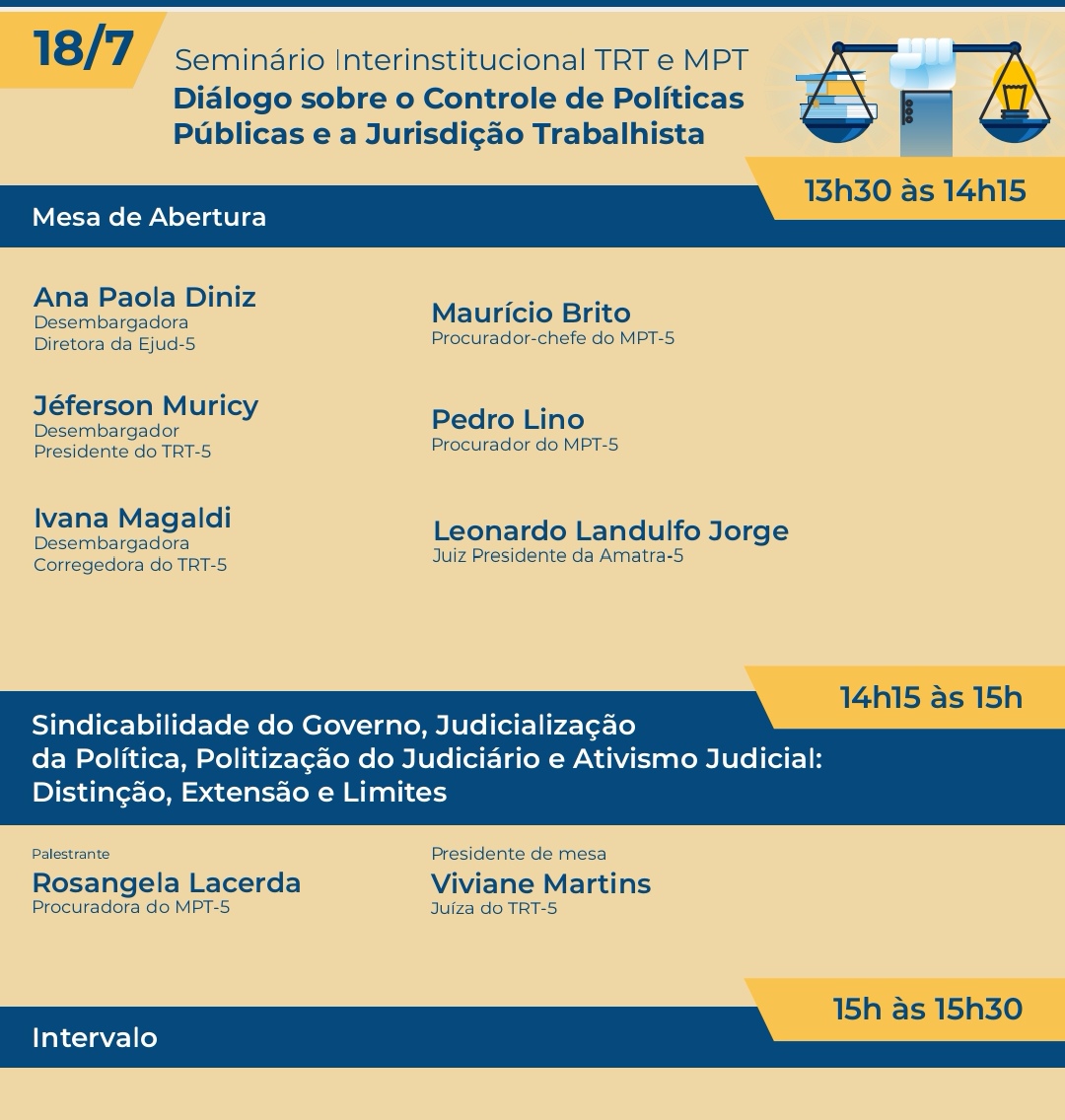 Serão discutidos temas como: Sindicabilidade do Governo, Judicialização da Política, Politização do Judiciário e Ativismo Judicial, numa abordagem que caberá à procuradora do MPT Rosângela Lacerda.