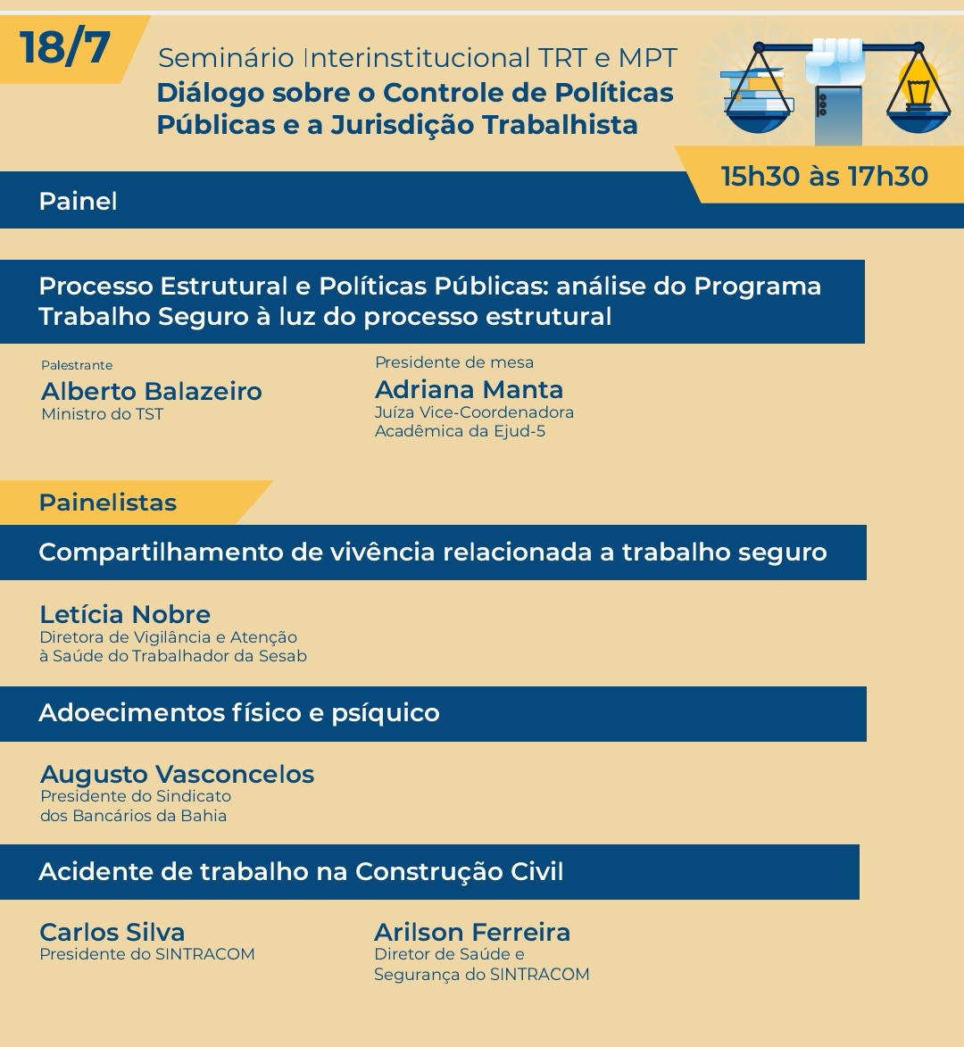 O presidente do SINTRACOM-BA Carlos Silva e o diretor de Saúde e Segurança Arilson Ferreira participam como painelistas e vão falar sobre “Acidentes do Trabalho na Construção”, no painel “Processo Estrutural e Políticas Públicas: análise do Projeto Trabalho Seguro à luz do processo estrutural”, que terá como palestrante o ministro do Tribunal Superior do Trabalho Alberto Balazeiro, na quinta-feira, dia 18/07, das 15h30 às 17h30, no auditório do Ministério Público do Trabalho, no Corredor da Vitória.