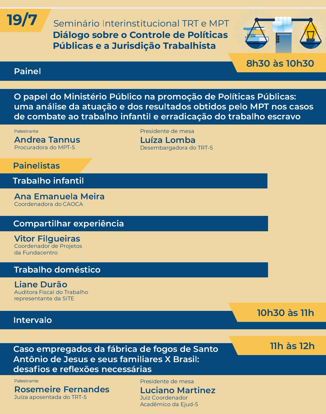 A programação prossegue no dia 19/07, no auditório do TRT5, em Nazaré, das 08h30 às 12 horas. O evento é realizado numa parceria entre o MPT Bahia e a Escola Judicial do Tribunal Regional do Trabalho da 5ª Região (Ejud-5).