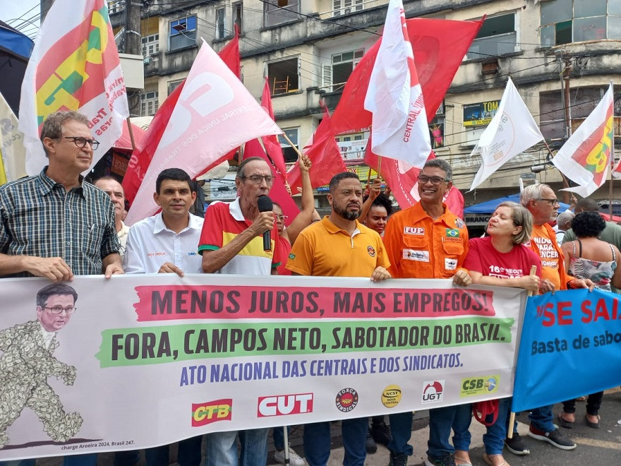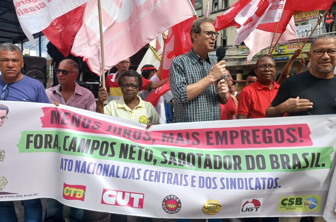 “Quem paga conta, cartão e cheque especial, sabe que os juros no Brasil são um absurdo. Beneficiam banqueiros e especuladores. E o governo tem que pagar juros da dívida pública, deixando de investir mais na área social. Quem decide a taxa de juros é o Banco Central, cujo presidente é Roberto Campos Neto, colocado por Bolsonaro. Ele sabota o projeto que o povo elegeu com Lula e que já mudou muita coisa no País. Vamos manter os protestos até que o Copom do BC reduza a Selic”, afirmou Emanoel Souza, vice-presidente da CTB Bahia.