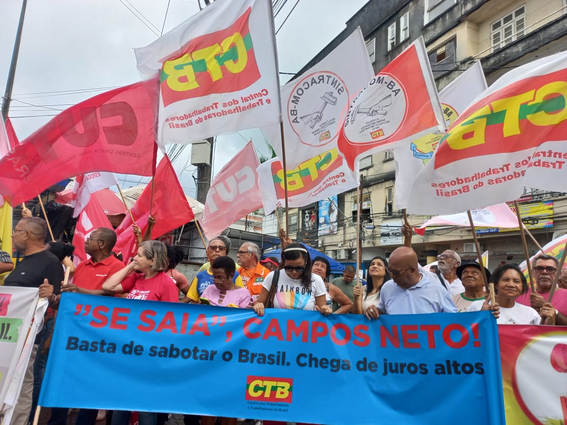 “Menos juros, mais empregos. Fora, Campos Neto, sabotador do Brasil”. Esta foi a palavra de ordem levada às ruas pela direção do SINTRACOM-BA, junto com a CTB e outros sindicatos, na manifestação contra os juros altos, que aconteceu nesta terça-feira, em frente ao Center Lapa, em Salvador e em todo o Brasil, organizada pelas centrais sindicais.