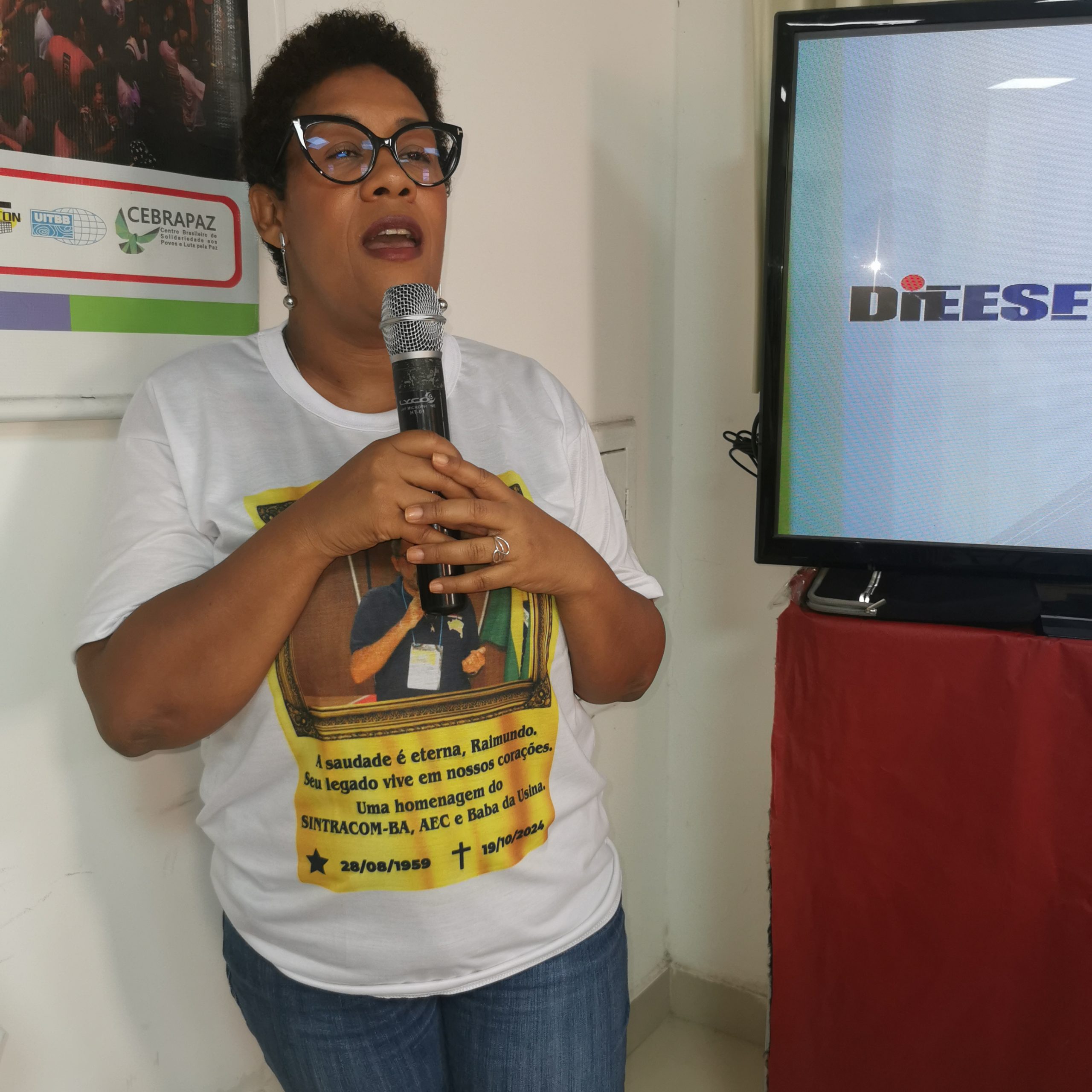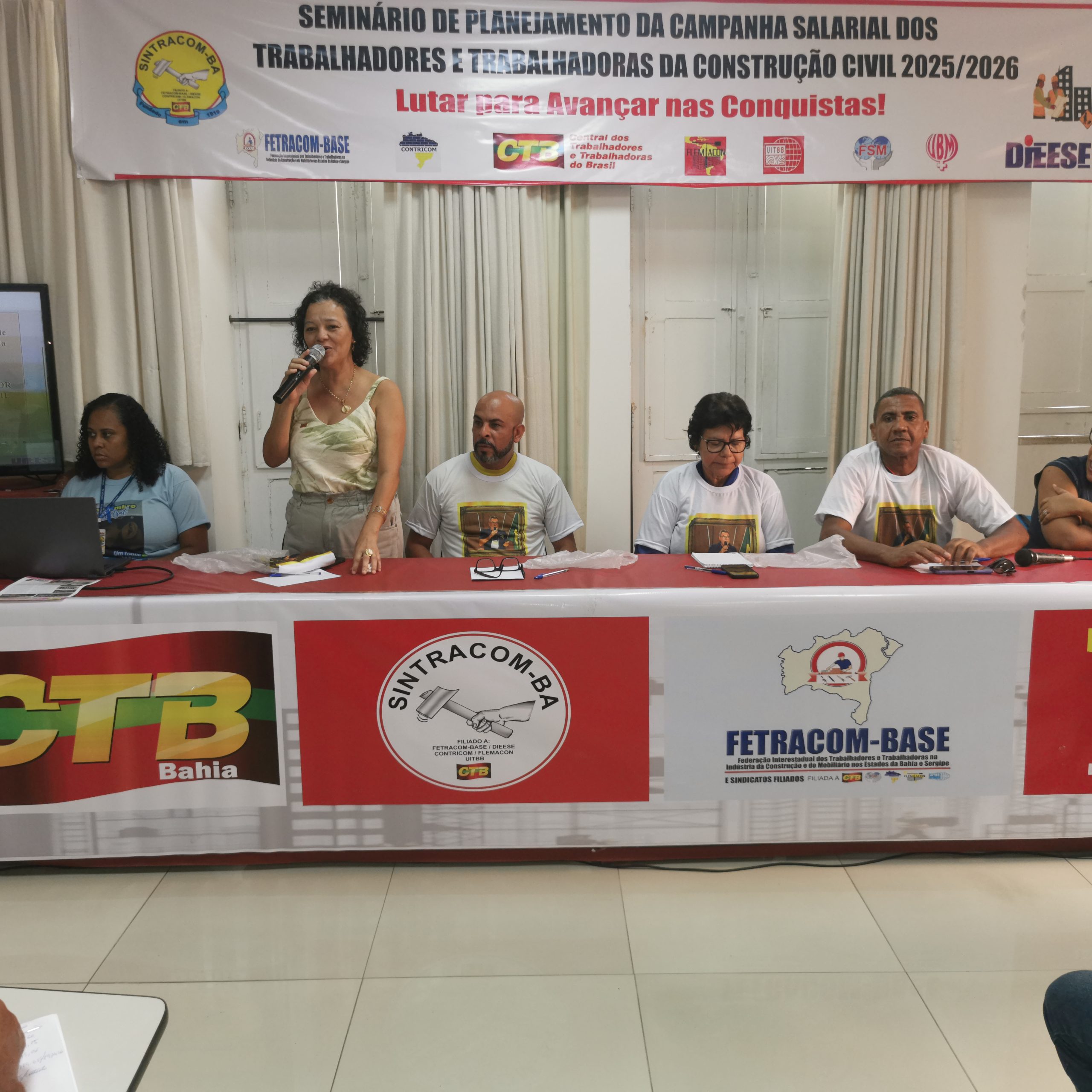 O Seminário foi aberto pelo presidente do SINTRACOM-BA, Carlos Silva, e participaram também da mesa a presidenta da FLEMACON, Lúcia Maia, o diretor do SintracomSAJ, Valdemir Souza, a presidenta da CTB-BA, Rosa de Souza e a superintendente técnica do DIEESE, economista Ana Georgina Dias, que fez uma palestra sobre Conjuntura econômica e seus reflexos nas convenções coletivas (leia boxe).