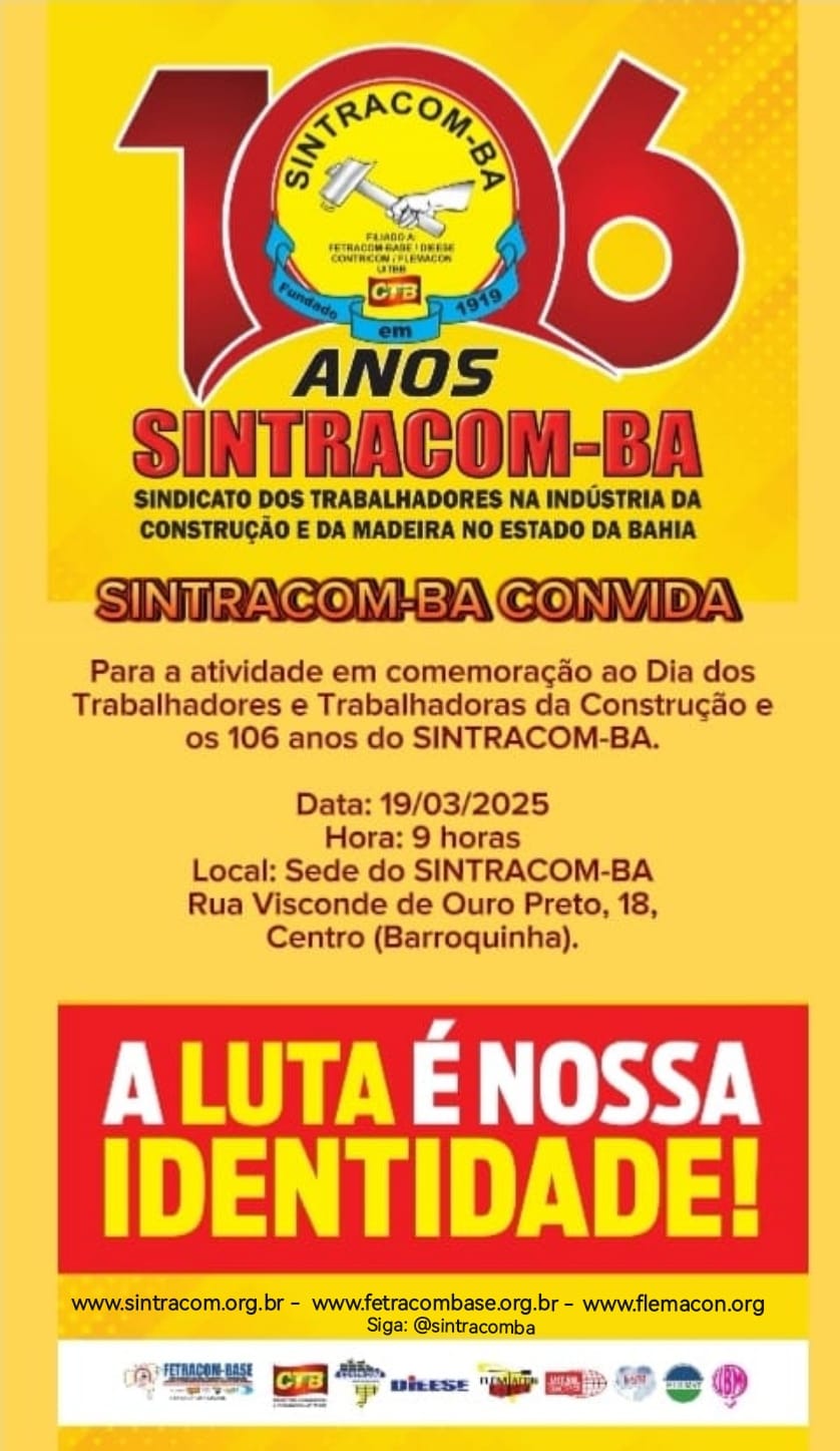 O Dia do Trabalhador (a) da Construção Civil, 19 de Março, é feriado, uma conquista da luta operária junto com o SINTRACOM-BA e a FETRACOM-BASE.