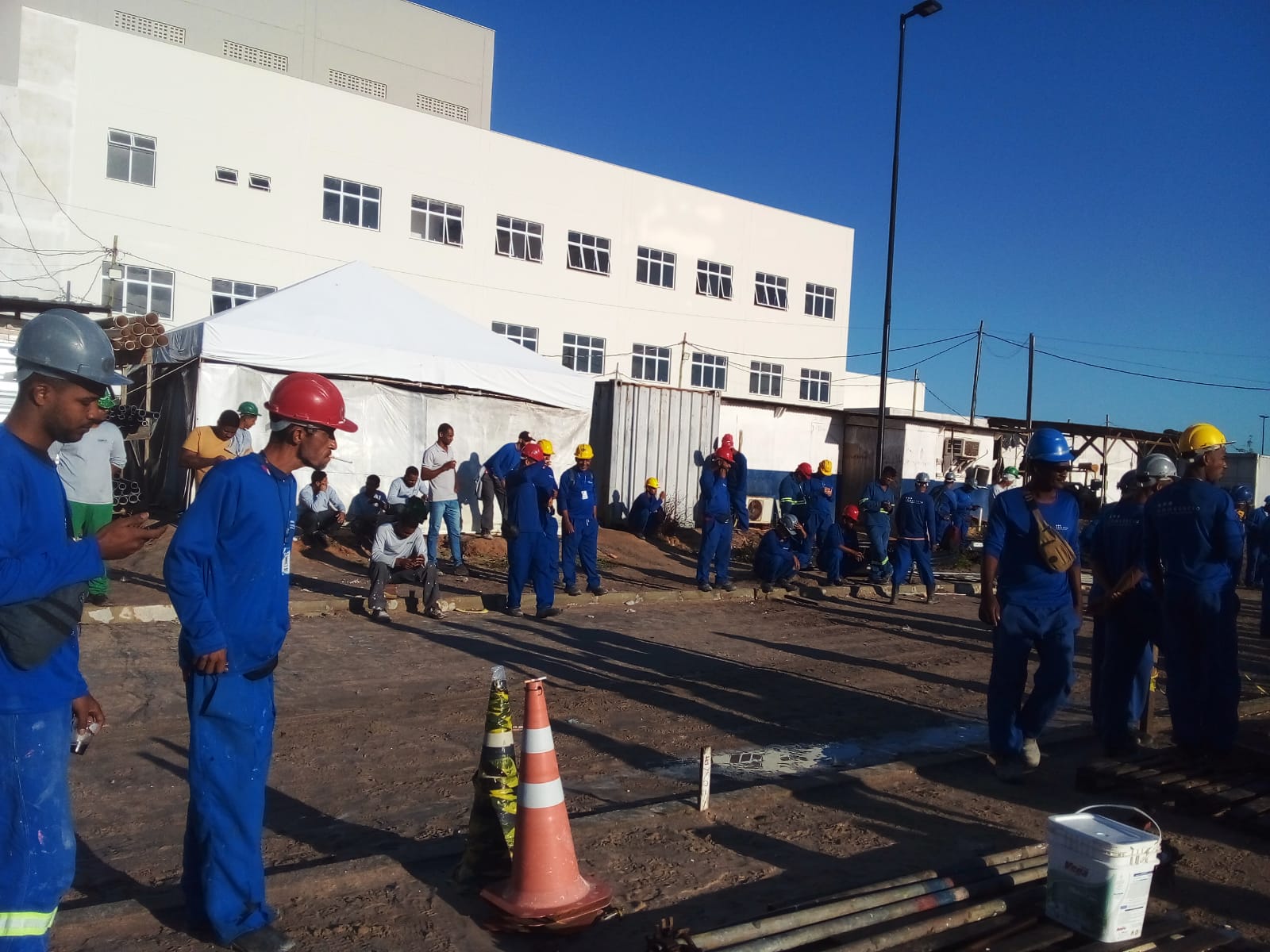 Os diretores do SINTRACOM-BA, Ailton dos Santos e Antônio Carlos dos Santos, participaram hoje, 22/07, do DDS no canteiro de obras do Hospital Regional de Alagoinhas.