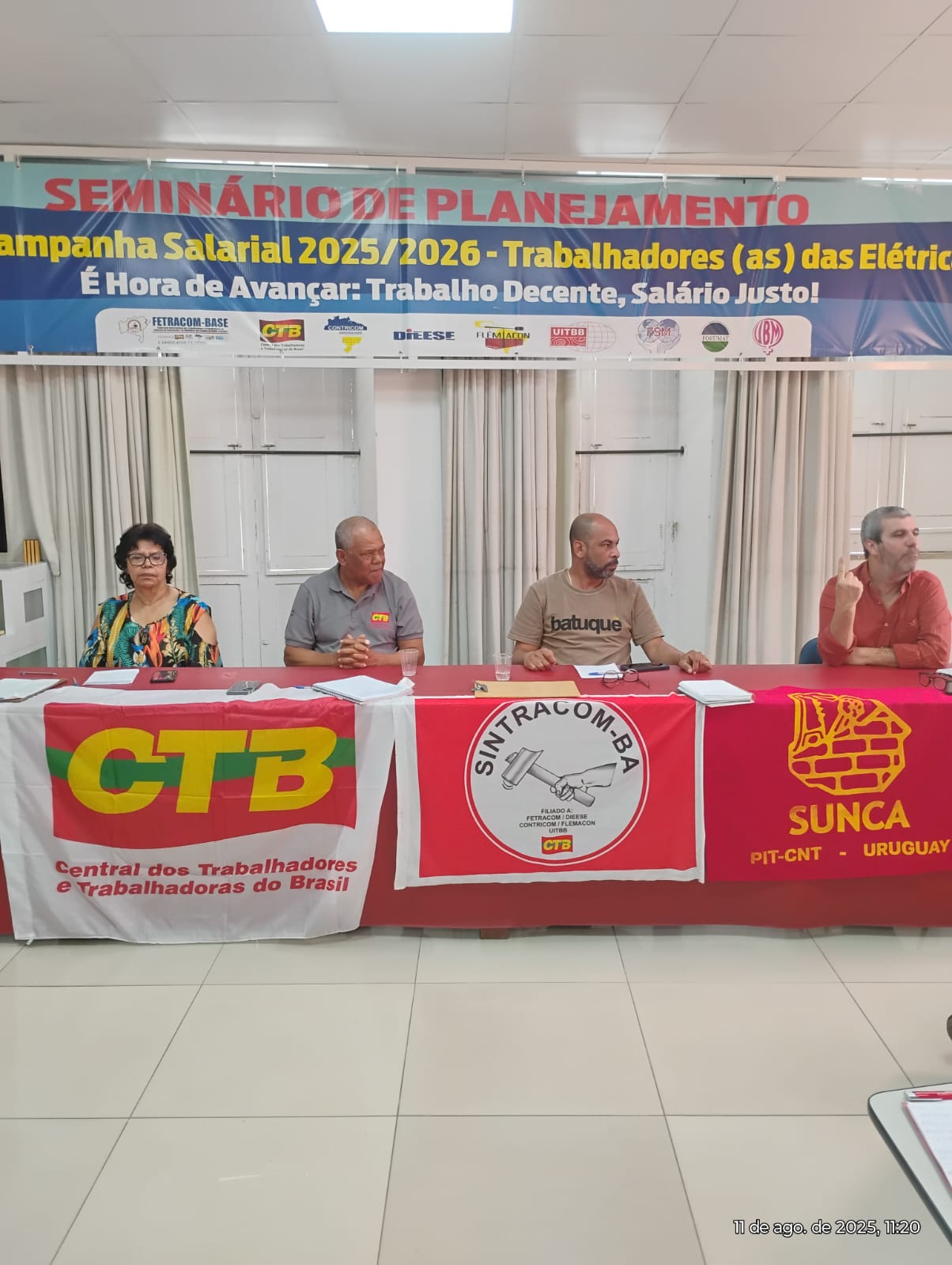 Carlos Silva, presidente do SINTRACOM-BA; Florisvaldo Bispo, secretário geral; Lúcia Maia, diretora de Imprensa, que também é presidenta da Federação Latino-americana dos Trabalhadores da Construção, Madeira e Materiais de Construção (FLEMACON); e Javier Días (UITBB e SUNCA) formaram a composição da mesa.