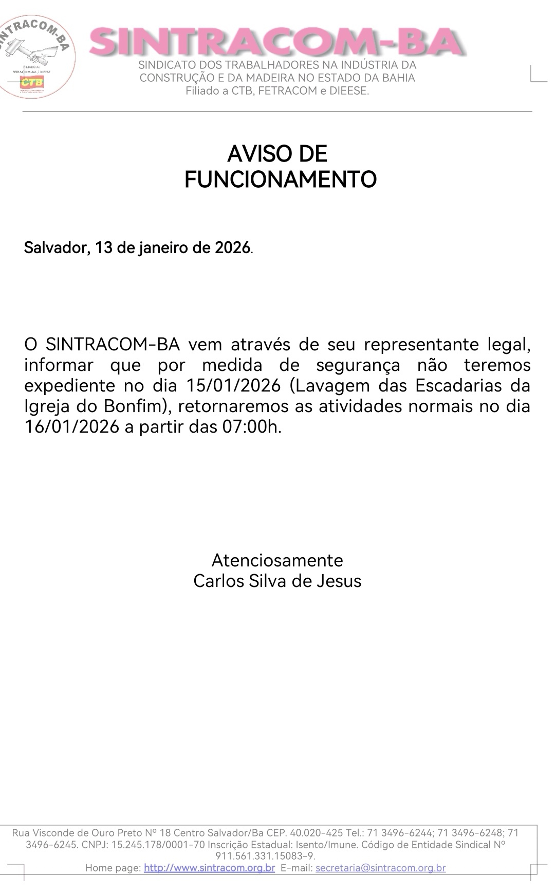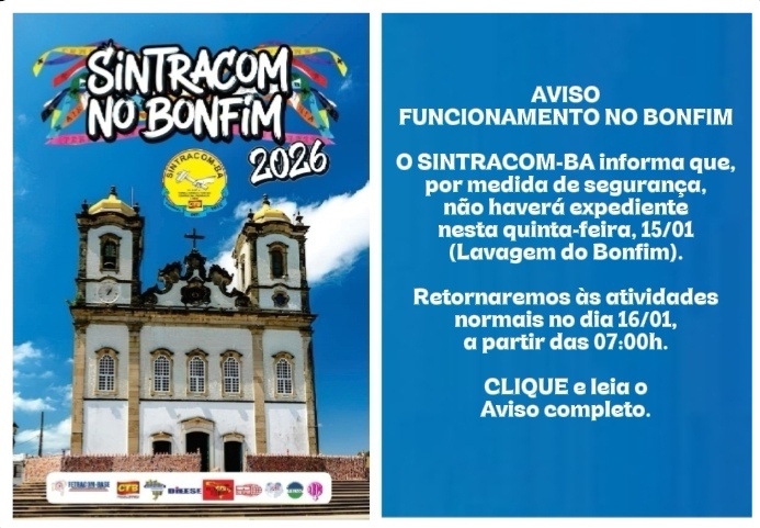 O SINTRACOM-BA vem através de seu representante legal informar que, por medida de segurança, não teremos expediente no dia 15/01/2026 (Lavagem das Escadarias da Igreja do Bonfim), retornaremos às atividades normais no dia 16/01/2026, a partir das 07:00h.