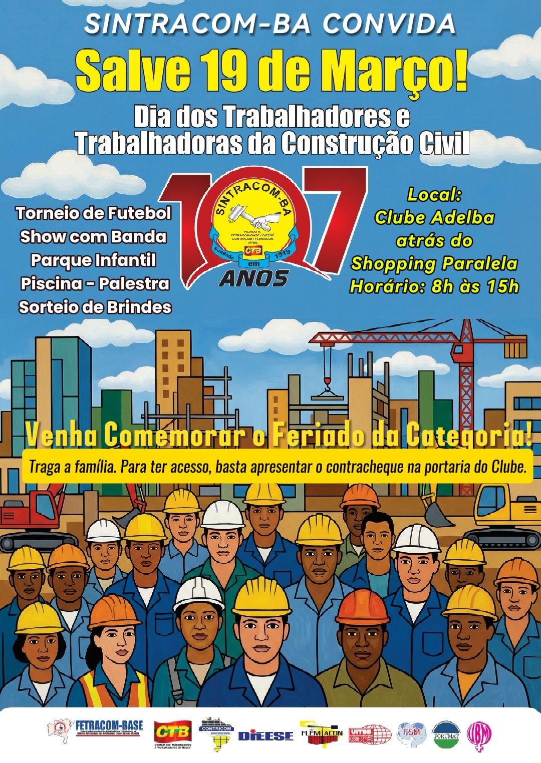 19 DE MARÇO: SINTRACOM-BA celebra 107 anos de fundação e convida a categoria para comemorar o feriado do Dia dos Trabalhadores (as) da Construção Civil