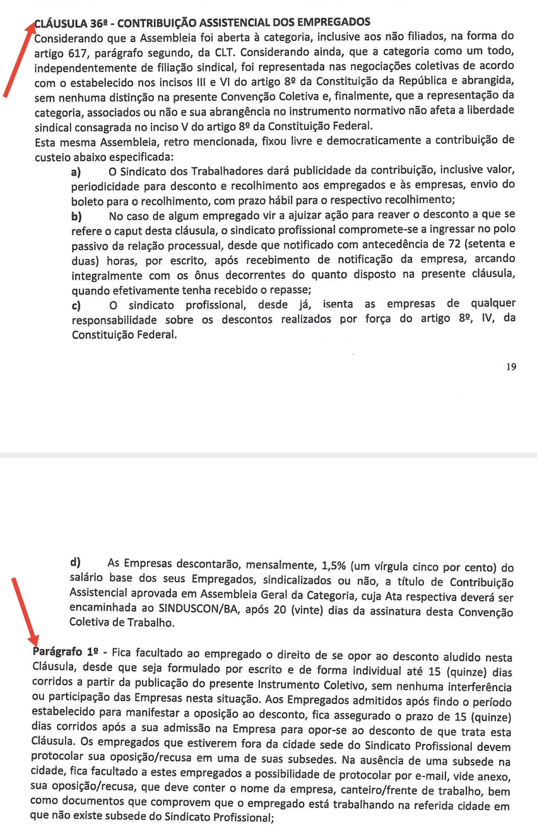 O documento deve ser por escrito e de forma individual e entregue ao SINTRACOM-BA, conforme descrito no parágrafo 1º da referida Cláusula 36ª da Convenção Coletiva de Trabalho. Veja abaixo.