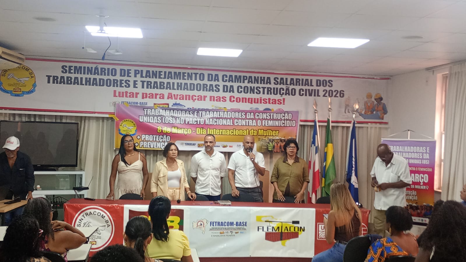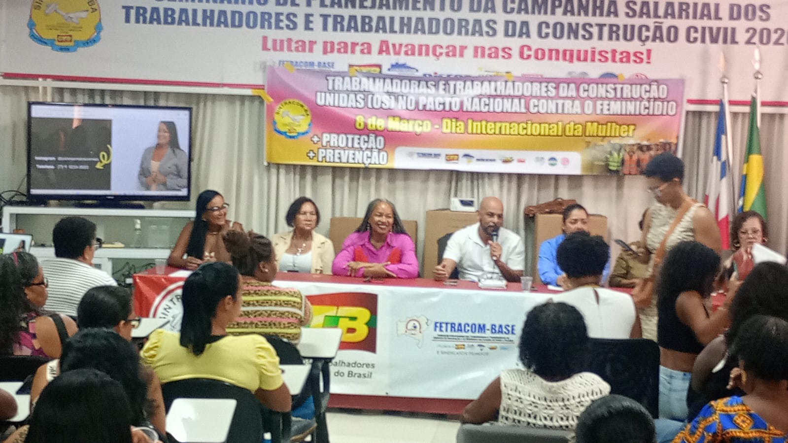 O presidente do SINTRACOM-BA Carlos Silva, fez a abertura do evento e anunciou as convidadas (os) à mesa. E apresentou o resultado de uma pesquisa sobre os casos de violência contra a mulher e Feminicídio, após os jogos de futebol: geralmente acontecem, quando o time do companheiro perde o jogo e ele desconta a decepção e a raiva com atos de violência contra suas companheiras. Imagine a situação das mulheres num país que respira futebol e tem vários campeonatos durante o ano todo!