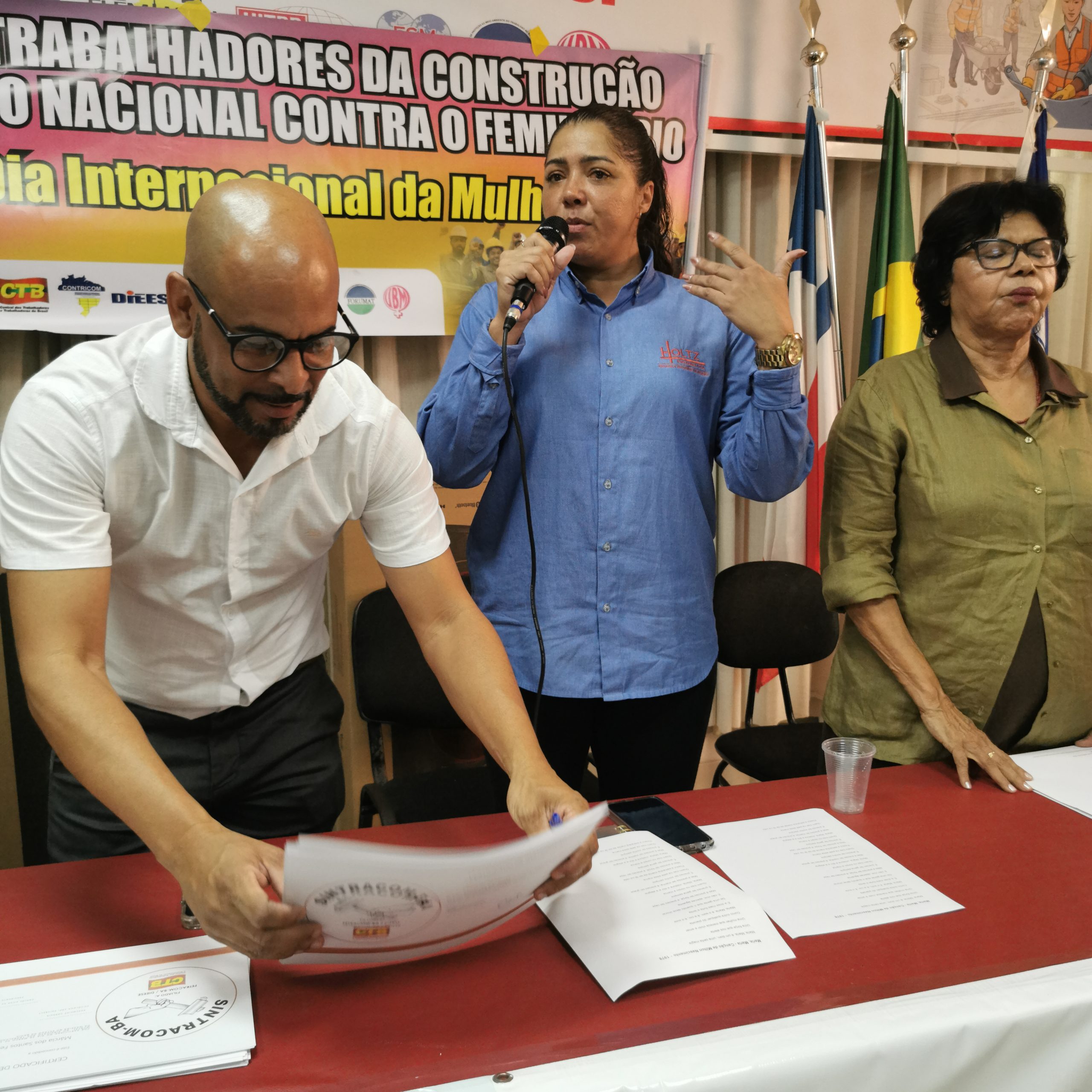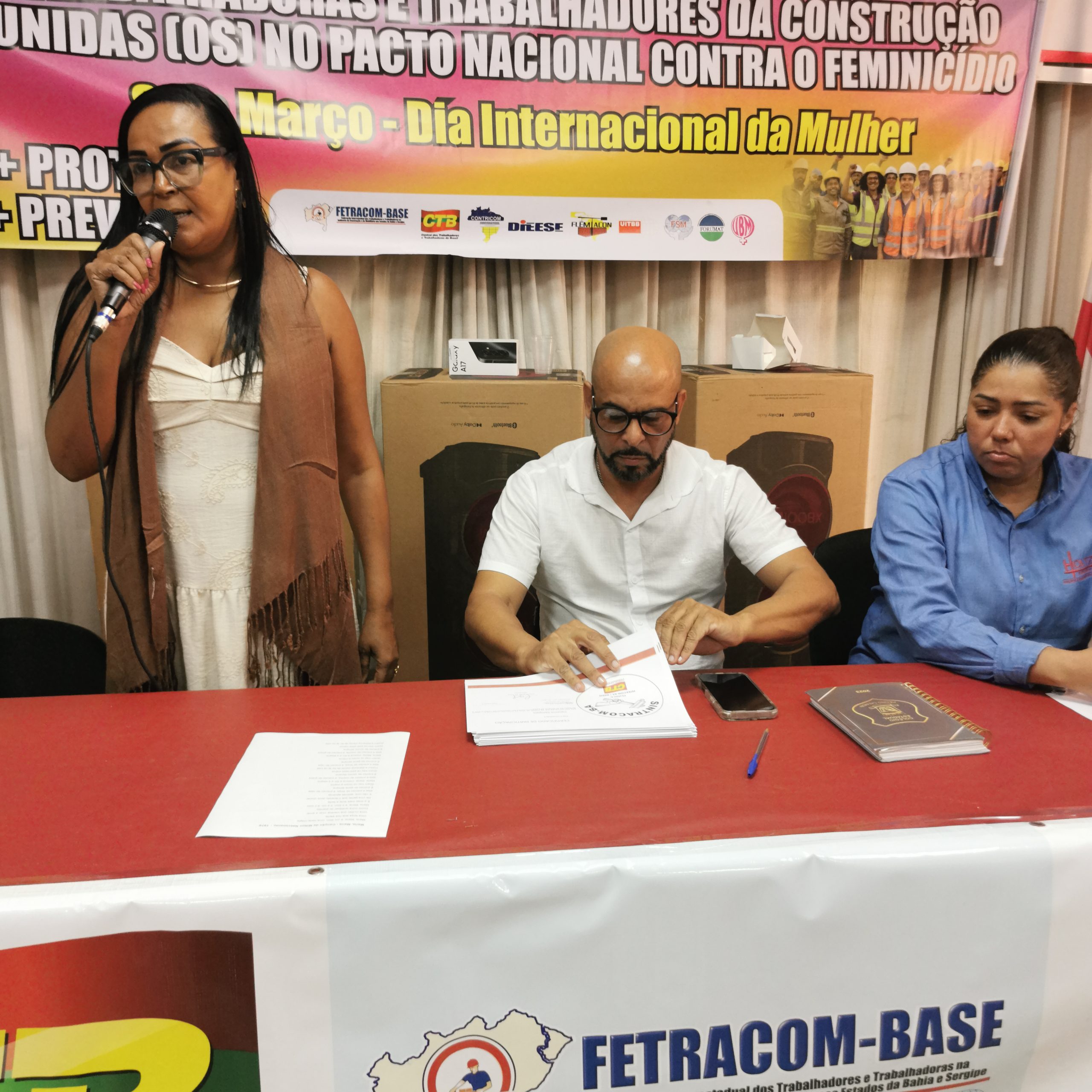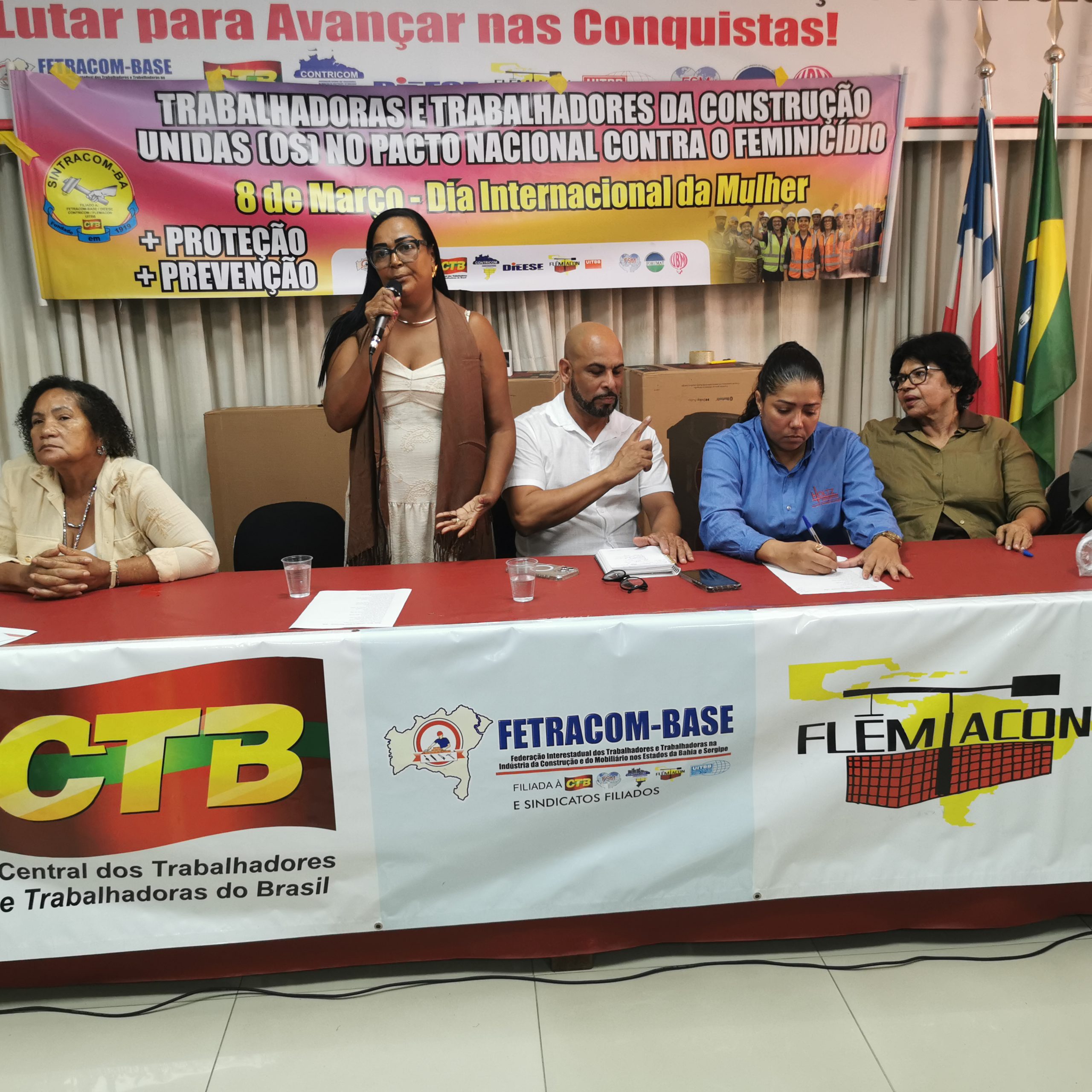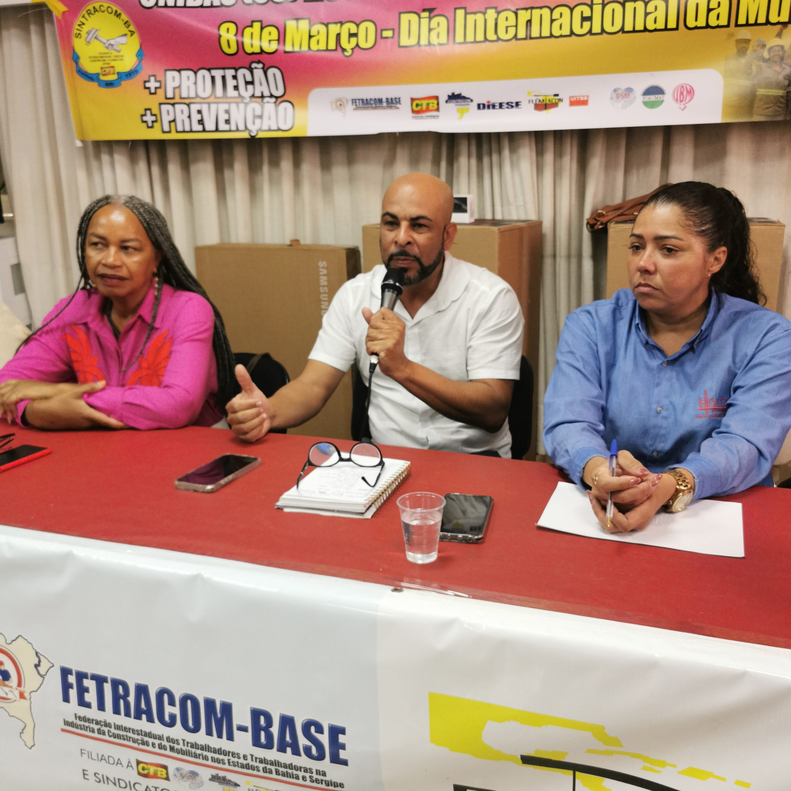 O Secretário Estadual de Trabalho, Emprego, Renda e Esportes (Setre), Augusto Vasconcelos fez uma saudação às trabalhadoras da construção civil pelo mês que celebra sua luta por direitos e ao SINTRACOM-BA pela realização de um evento abordando o Feminicídio – um tema tão importante para a sobrevivência das mulheres. Falou sobre o compromisso de promover uma maior presença de mulheres no mercado de trabalho, dos cursos de capacitação profissional que vem realizando na Setre, voltados para que mulheres possam se tornar profissionais da construção civil, que é importante para a economia. E ressaltou que as mulheres devem estar em todos os espaços.